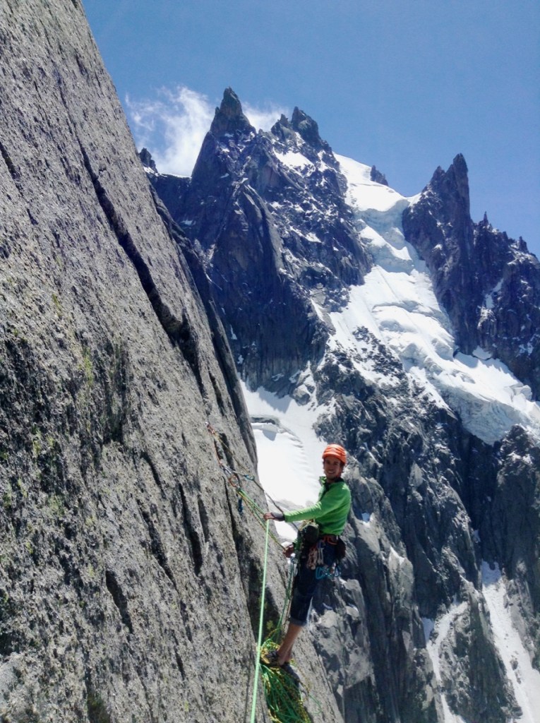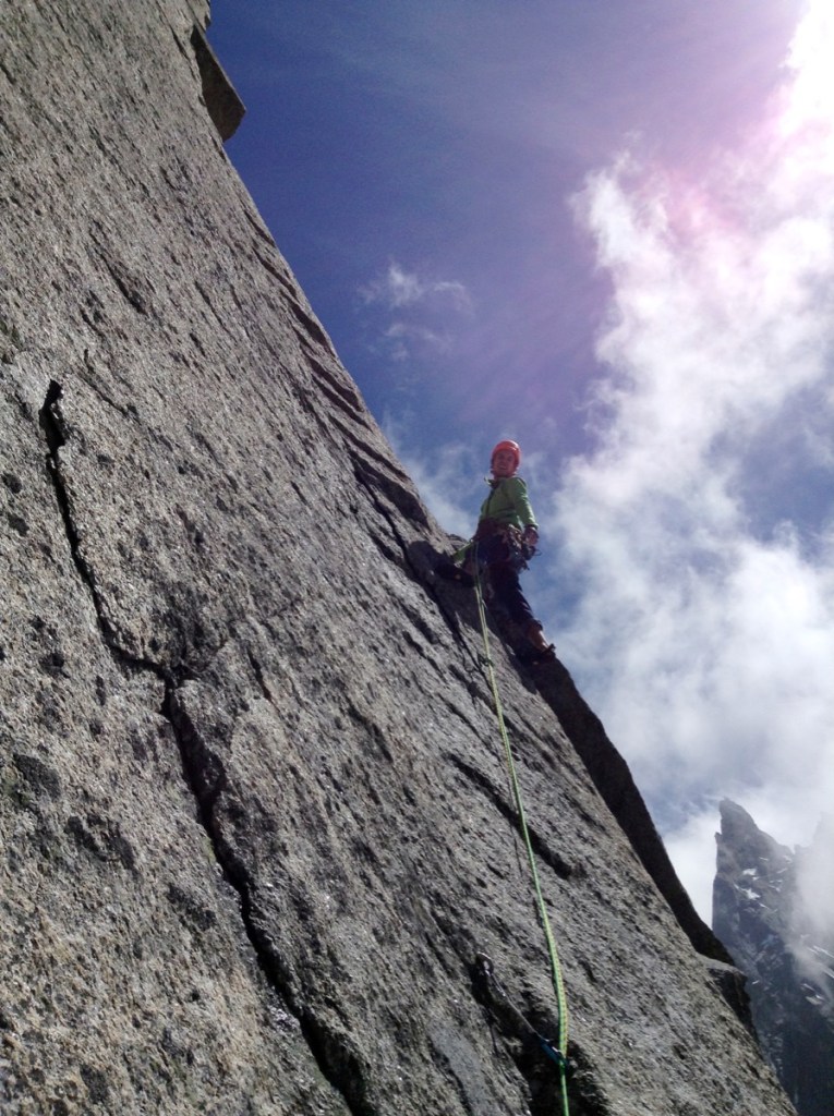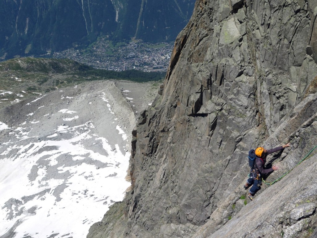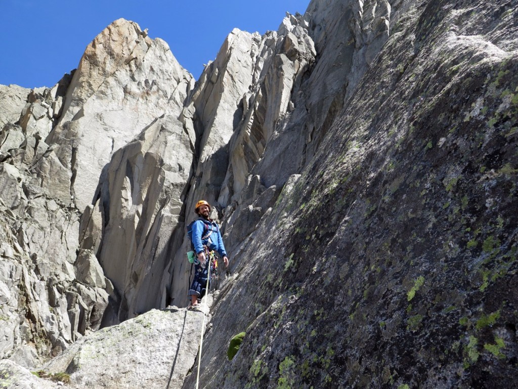 Après la quatrième longueur, le crux en 6c+ de la partie basse, j’ai le droit a la photo classique de la voie, sur fond d’aiguille du Plan.