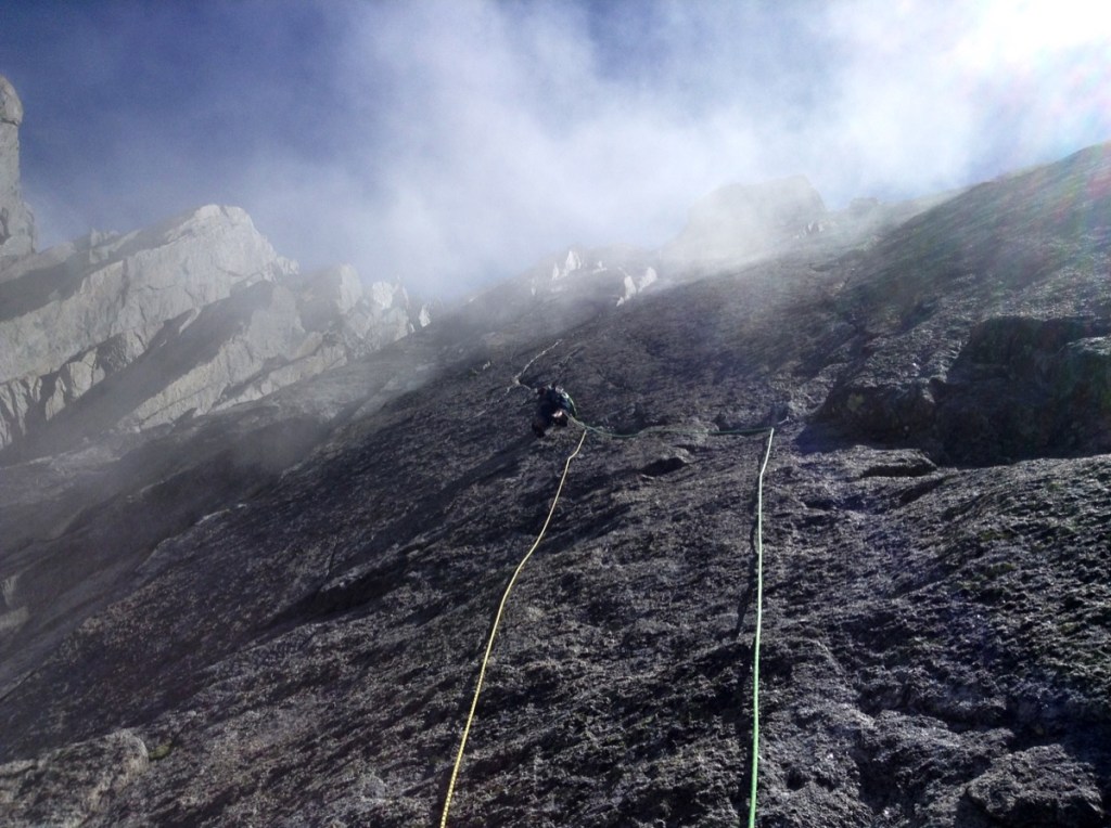 Après l’approche et la remonté du socle, on attaque directement par une longueur majeur, un 6b+ dans une fissure évasée, très soutenue à froid !