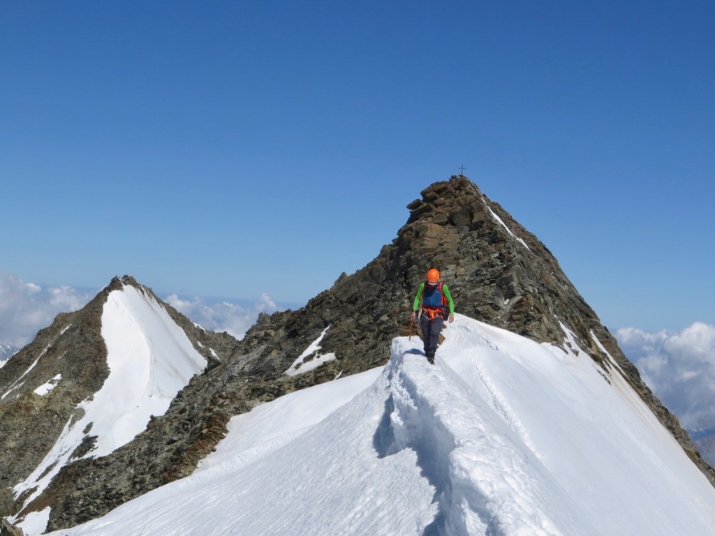 Malgré le ciel bleu, les nuages bourgeonnent et nous suggèrent de ne pas rester trop longtemps au sommet. On entame donc notre descente par la voie normale du Nadelhorn.