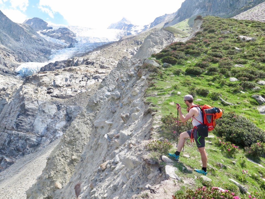 Nous choisissons d’emprunter la montée par la Bordier Hütte, qui au dessus du village de Sant-Nikolaus dans la vallée de Zermat… Ça change de chamonix, pas de remontées mécaniques, la monté se fait depuis le bas à pieds !