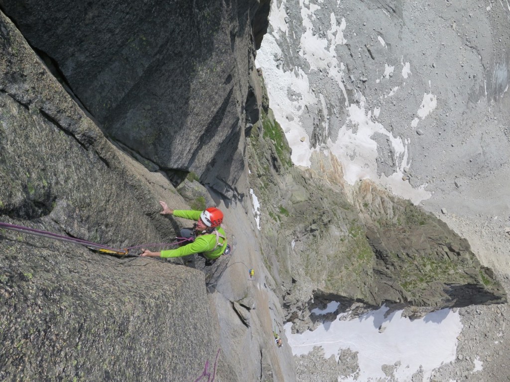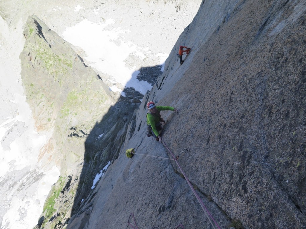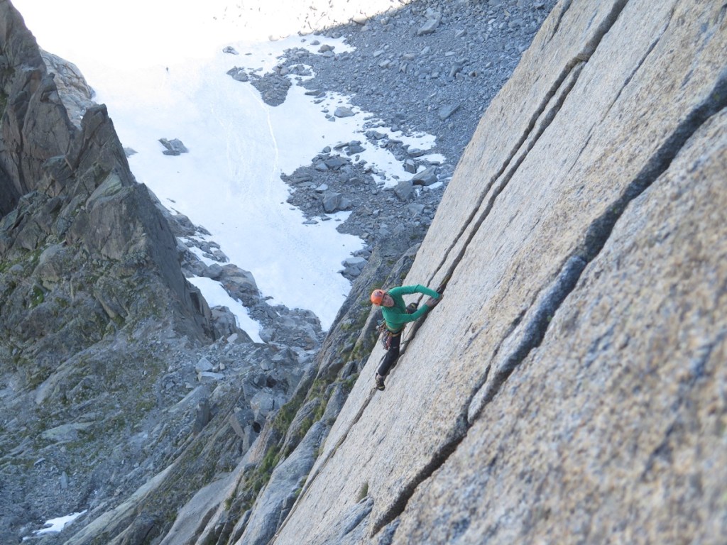 Une longueur de trasition en V+ nous amène à la dernière longueur, un 6c+ dalle suivi d’une belle fissure en 6b !