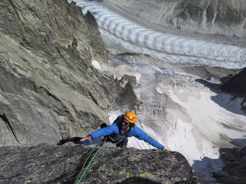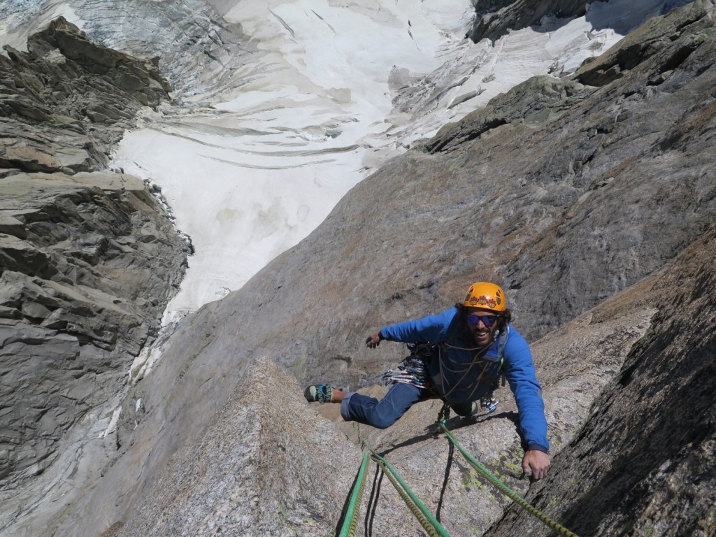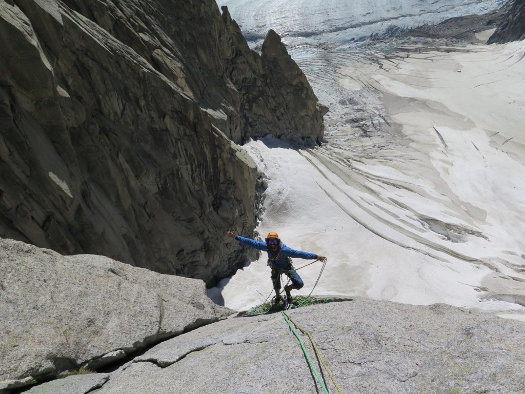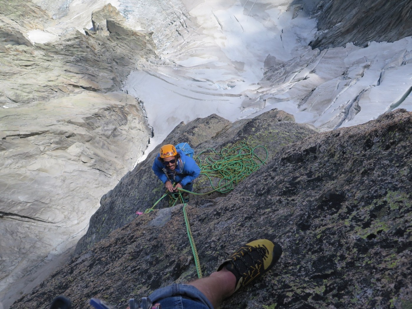 Après les premières longueurs grimpées à l’ombre, des spits dans les dalles non clipables écrases par les chutes de pierre, on sort enfin du socle oppressant avec le tout proche couloir du Fou, qui ce jour là n’aura pas fait un seul bruit.