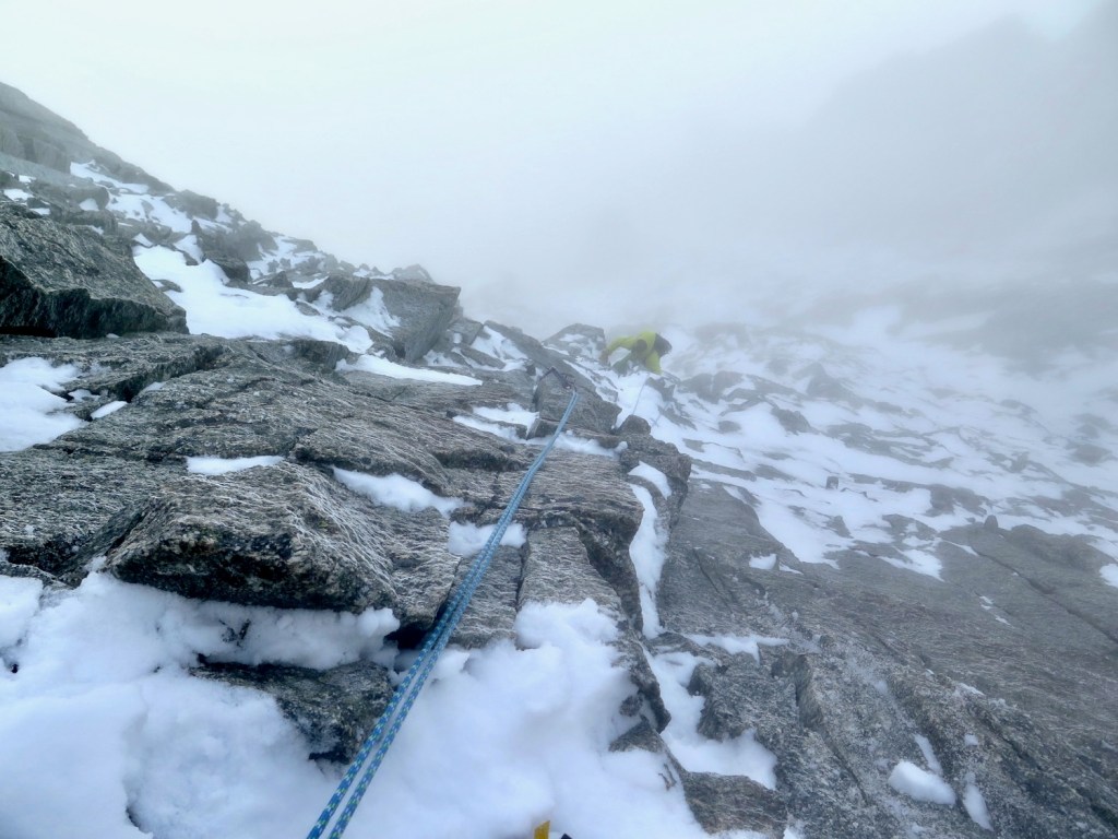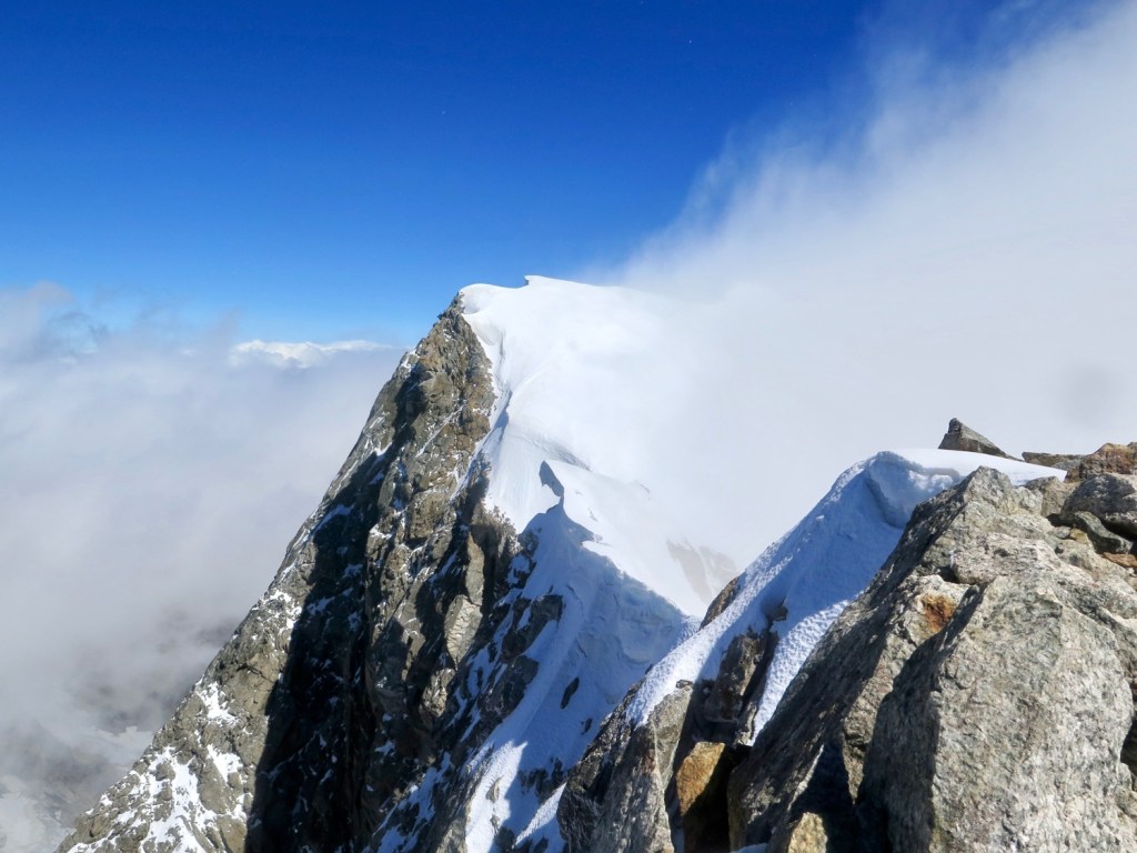 Bonne nouvelle, côté italien en face Sud, on est totalement à l’abri du vent qui souffle fort sur l’arrête. Il fait presque chaud ! cela nous motive donc a continuer.