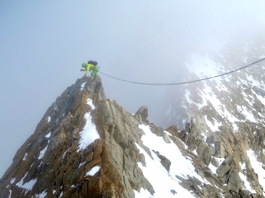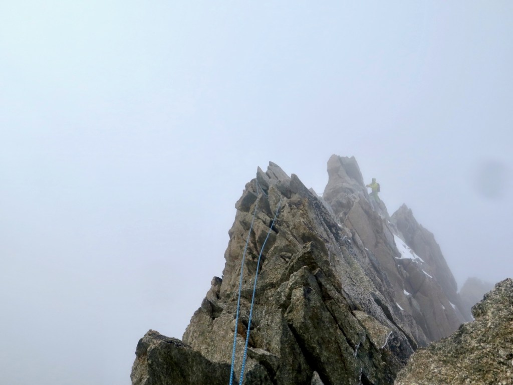 Après être passé par le sommet de la Pointe Marguerite dans un vent tempêtueux, on part dans la descente en désescalade très éfilée.