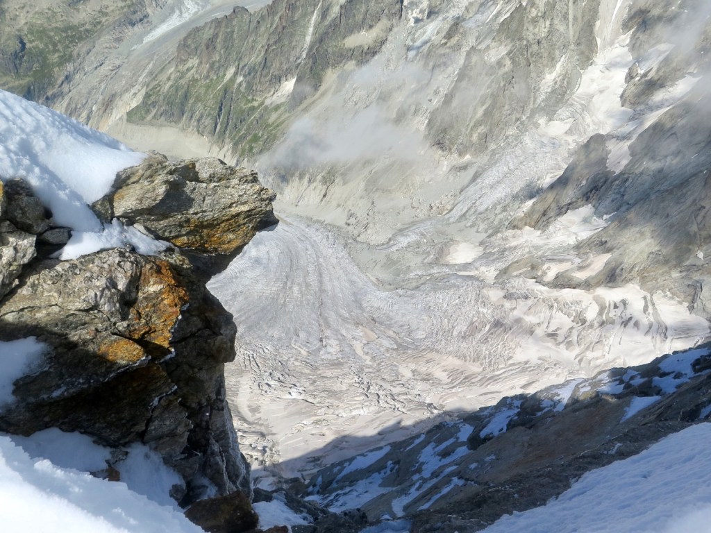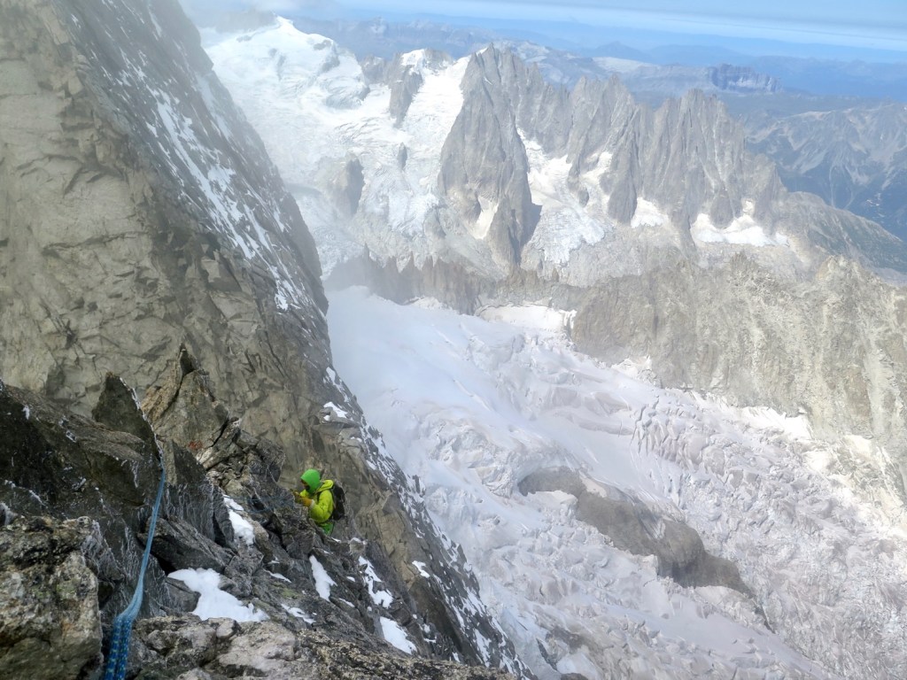 Après une bonne série de rappels, désaxés et difficile à gérer avec le vent, on se retrouve finalement au col des grandes Jorasses et au niveau du bivouac Canzio