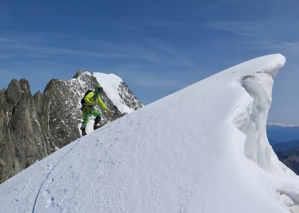 Après une montée par la voie normale de la Dent du Géant, on attaque par la mythique arête de Rochefort, avec l’iconique corniche-sérac présent sur toutes les photos.