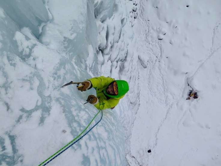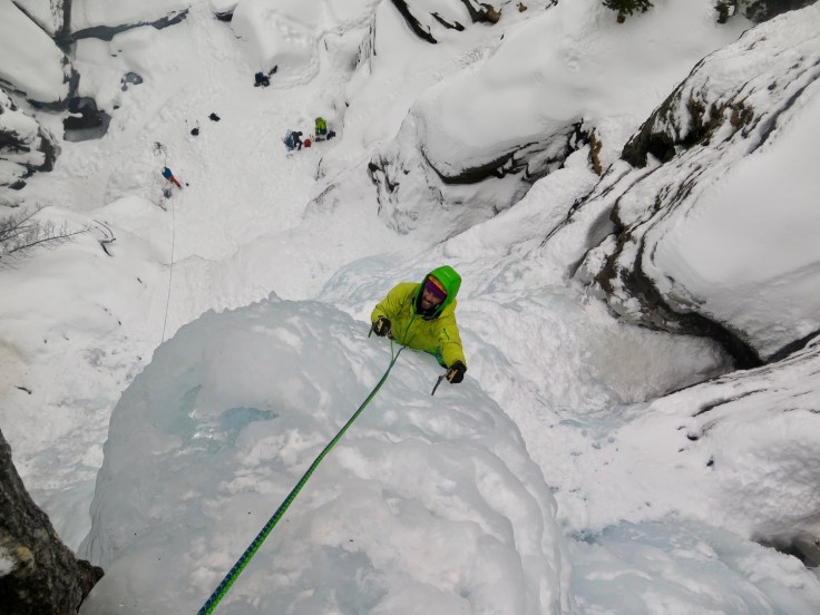 La deuxième longueur est bien atypique pour de la glace, se déroulant principalement en traversée presque horizontale… Normalement on a le choix entre deux possibilités : se faufiler derrière la draperie, ou bien passer plein gaz à l’extérieur. Lors de notre passage, pas le choix, faudra passer plein gaz !