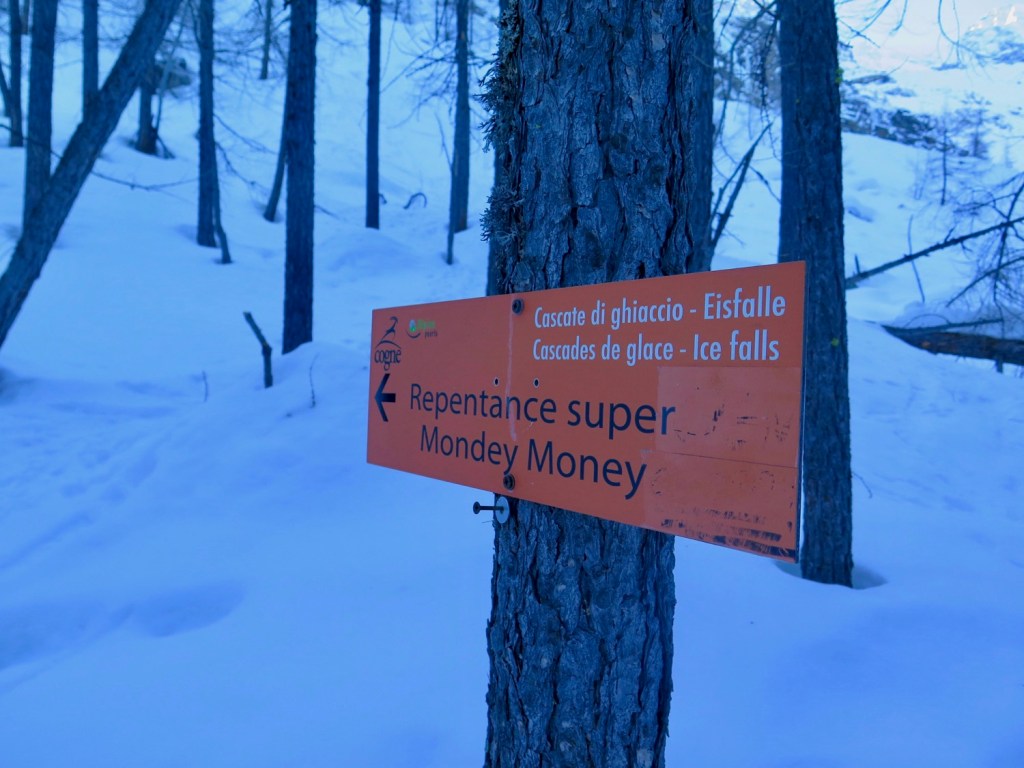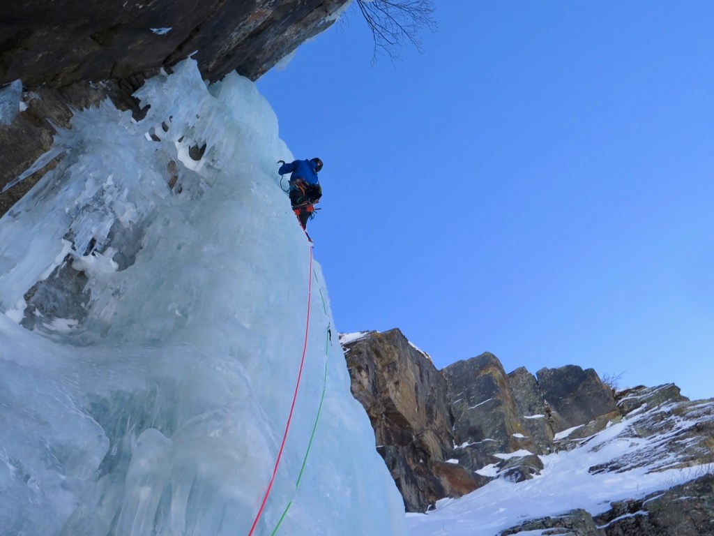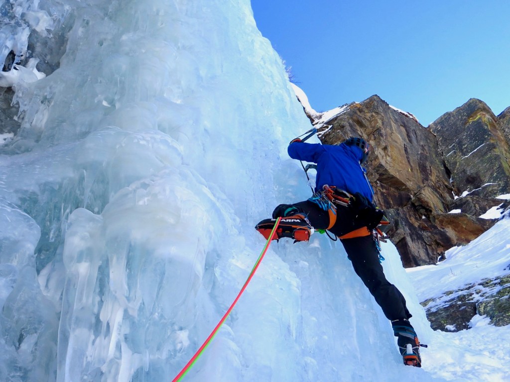 Cogne, Valnontey, Repentance Super. Grade 6, ED. Un intitulé qui me faisait rêver (et un peu peur aussi !) depuis un bon moment… C’est sans doute la cascade la plus connue de cogne, qui était la cascade la plus convoitée aux débuts de la cascade de glace difficile..