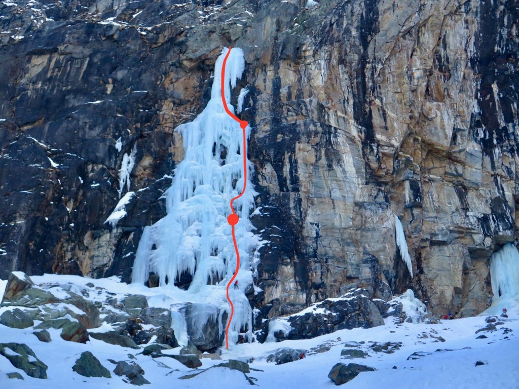 La première partie de la cascade, la plus convoitée, représente environ 90m d’escalade proche de la verticale, avec des cotations en glace entre 5 et 6.