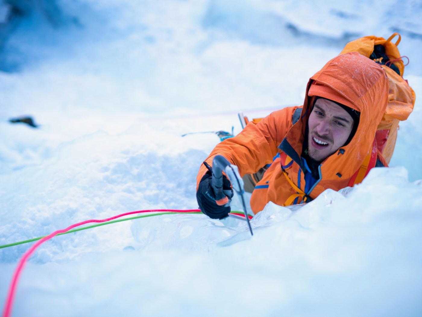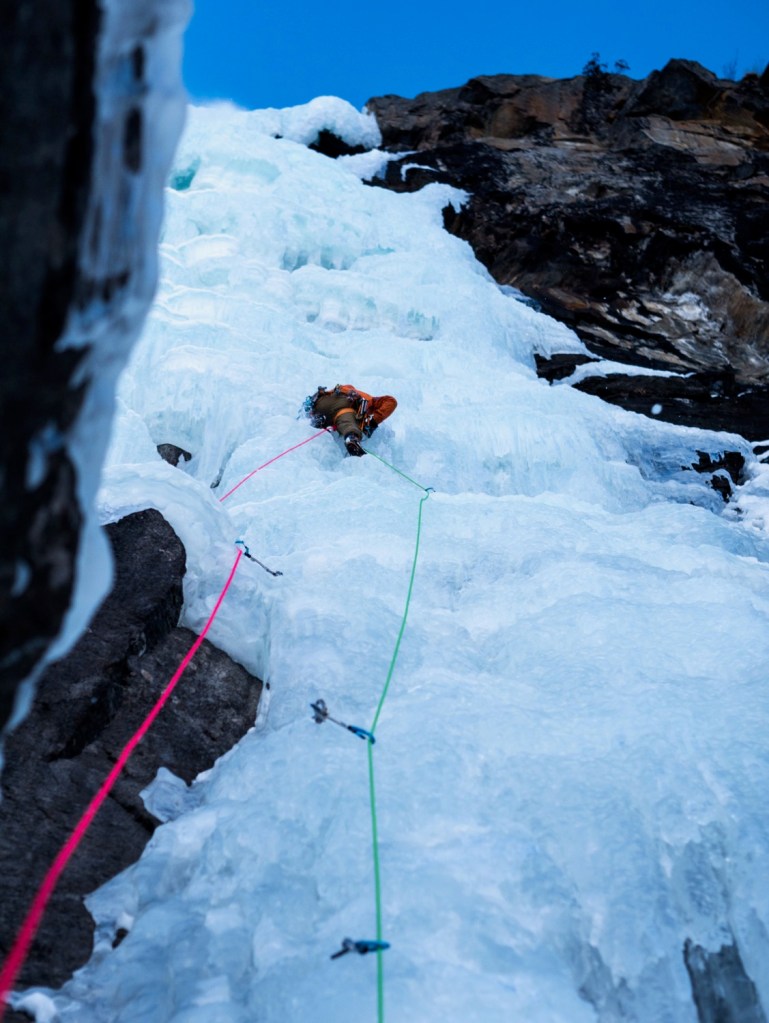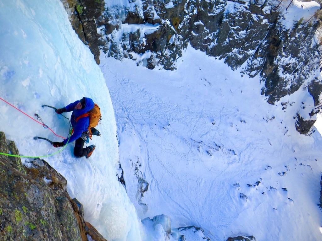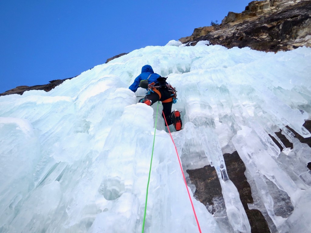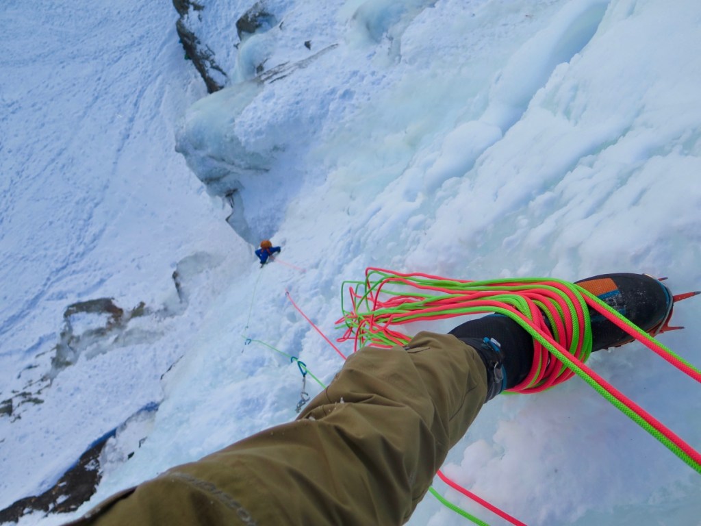 Morgan prends le relais et pars dans la deuxième longueur, longue, raide et technique, dans une glace sculptée. J’ai trouvé cette longueur même en second comme étant la plus difficile de la journée de part sa continuité.