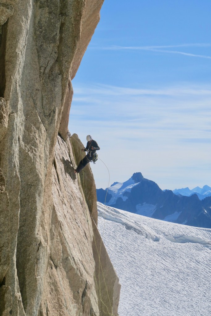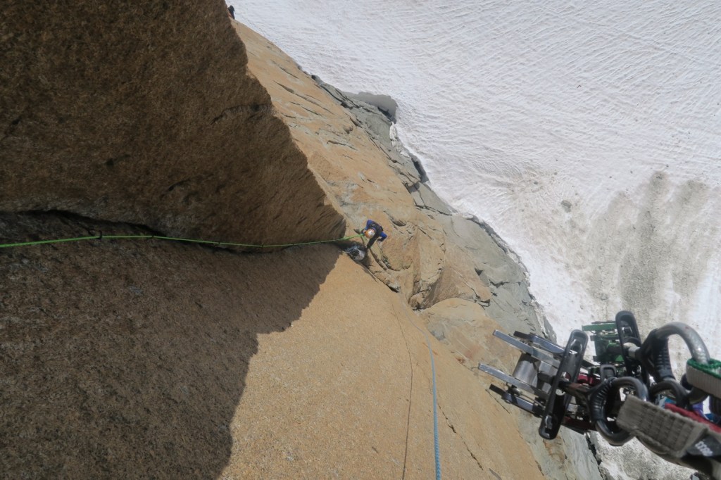 C’est la mi-aout, la montagne se réchauffe… mieux vaut privilégier le beau granite ensoleillé, moins sujet au déboires du permafrost. Avec Micka Chatellard, on fait le choix de la fainéantise, et de prendre le téléphérique de l’Aiguille du midi, pour aller tranquillement grimper en face S en milieu de journée.