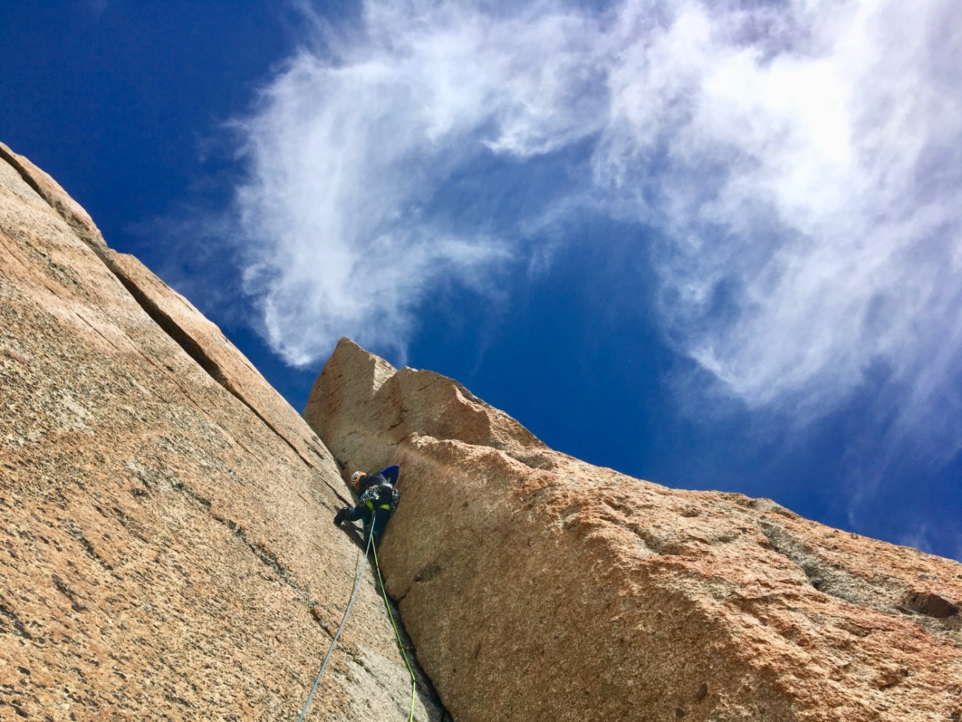 Je pars ensuite dans le deuxième dièdre, qui est un longueur d’anthologie en 7a… Plus on monte plus c’est raide, plus c’est dur, et plus la fissure est large. il y a un spit dans la longueur, et après un bon combat je finirais par voler en essayant de le cliper à bout de bras ! de quoi prendre quelques jolies photos suspendues !