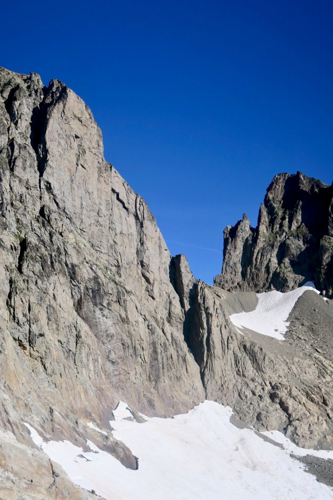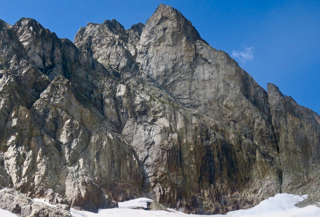 Pour ne pas faire le détour par le Lac Blanc, nous prenons un raccourci par un couloir à gauche de la tour des crochus. On aperçoit enfin la belle face et la ligne directe de notre objectif du jour, Le Mariage de la Terre et du Vent. Quel magnifique nom de voie pour cette pépite ouverte par Michel Piola.