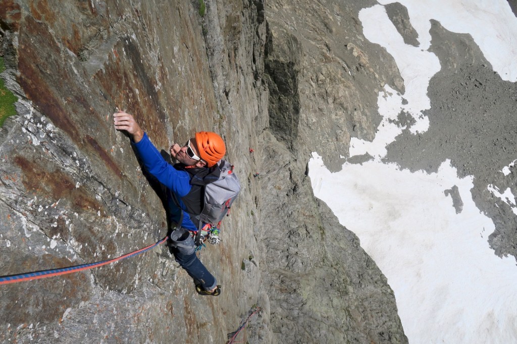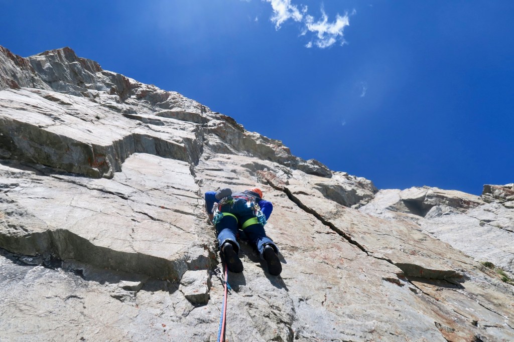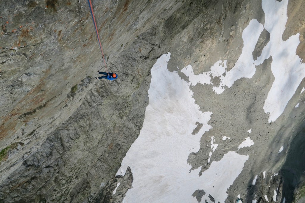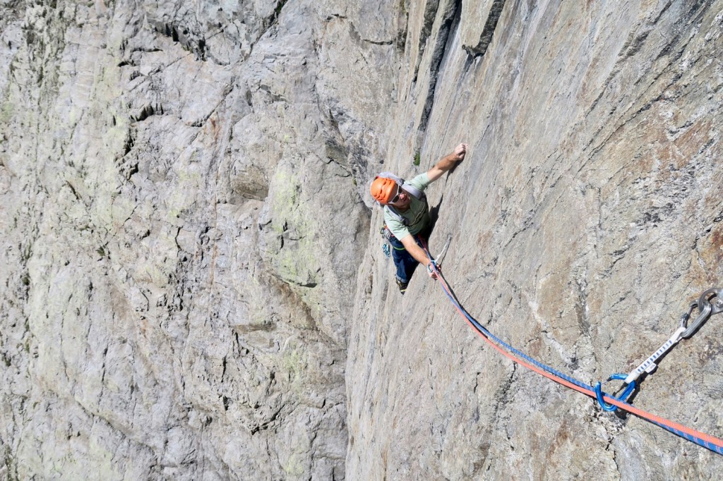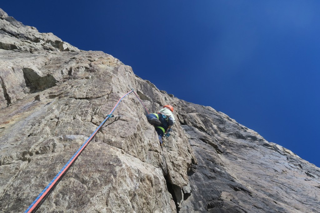 Après la vire, la face semble coupée au couteau, et la grimpe continue, exigeante, avec des difficultés entre 6c et 7a…