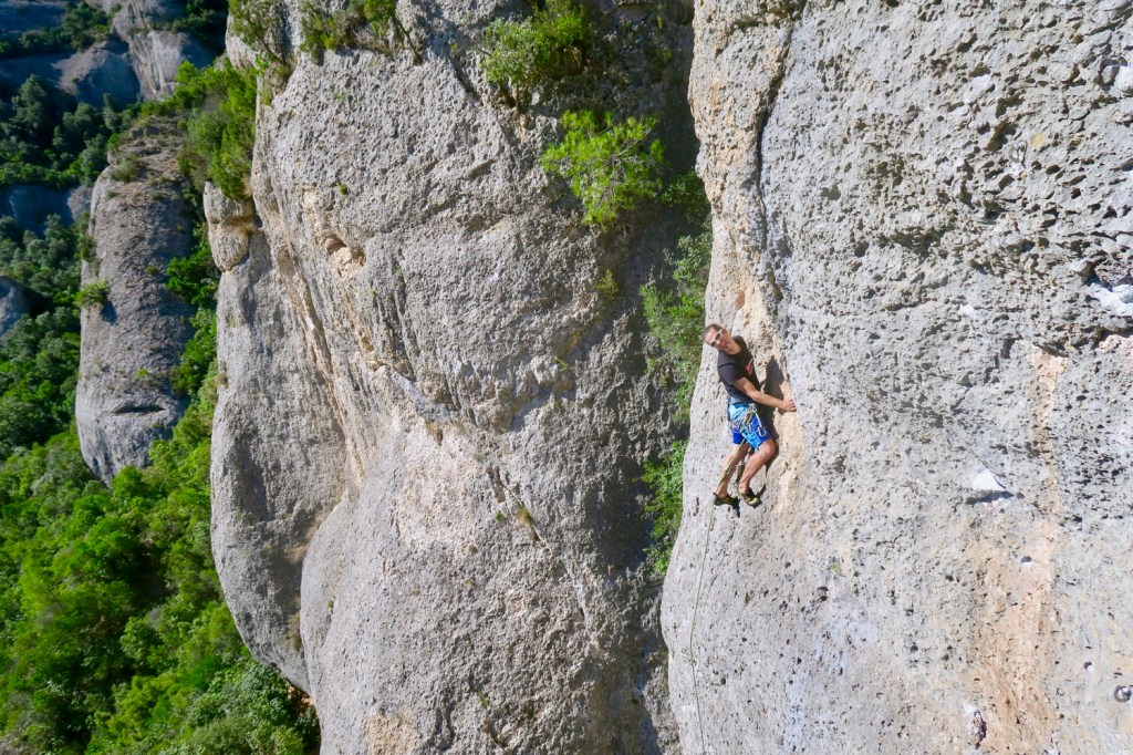 L’idée est d’aller se familiariser avec le beau conglomérat de Margalef, un beau village isolé qui a du charme, dans lequel on se sent bien. Qui dit conglomérat dit trous, trous et encore des trous ! Vaut mieux avoir les doigts bien affutés. Le ticket d’entrée des belles lignes est au alentour de 6c, un certain niveau est requis pour se faire plaisir… Les premières longueurs nous auront bien corrigé. Heureusement on peut varier les profils et les inclinaisons pour économiser les bras et les doigt, et profiter pleinement de toute la diversité que ce petit paradis de l’escalade a à nous offrir…
