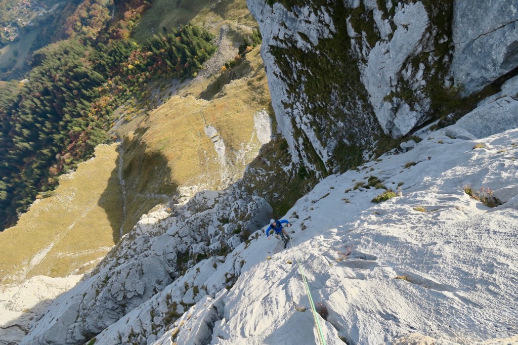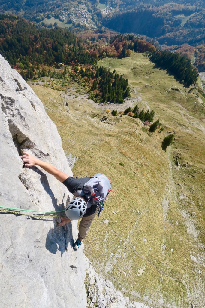 On attaque ensuite la partie finales de la voie, par des 4 longueurs soutenues quasiment exclusivement trad. L7 6c+ au départ de la vire est à dominante de fissures larges, numero 4 conseillé. L8 6c dans les cannelures, entrecoupés de pas de dalle. L9 6c en fissure franchit astucieusement 3 petits toits, magnifique. Enfin on sort par un dernier pur dans L10 6c pour sortir au sommet.