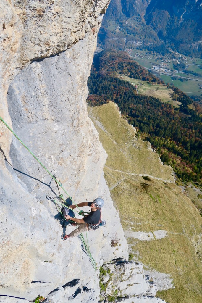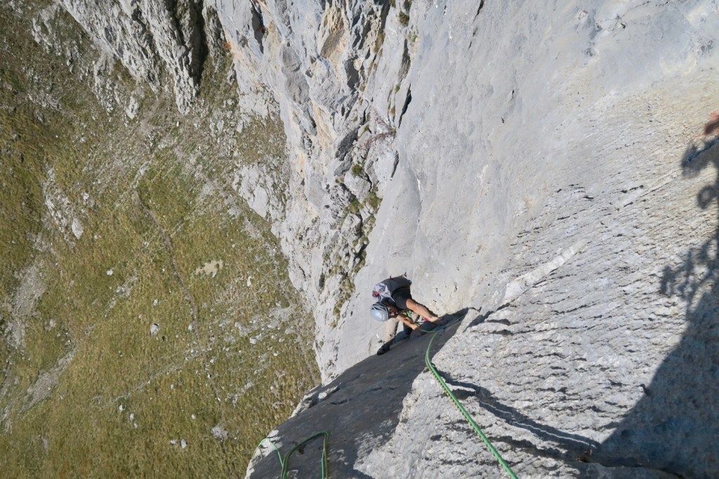 On continue ensuite avec L6 7a, qui consiste à passer un toit. Le franchissement du toit est équipé avec des spits, une fois franchis on repart en trad jusqu’à l’arête sommitale de la petite antécime. Après une courte longueur de transition, on fait un grand rappel de 50m pour descendre à la brèche en contrebas.