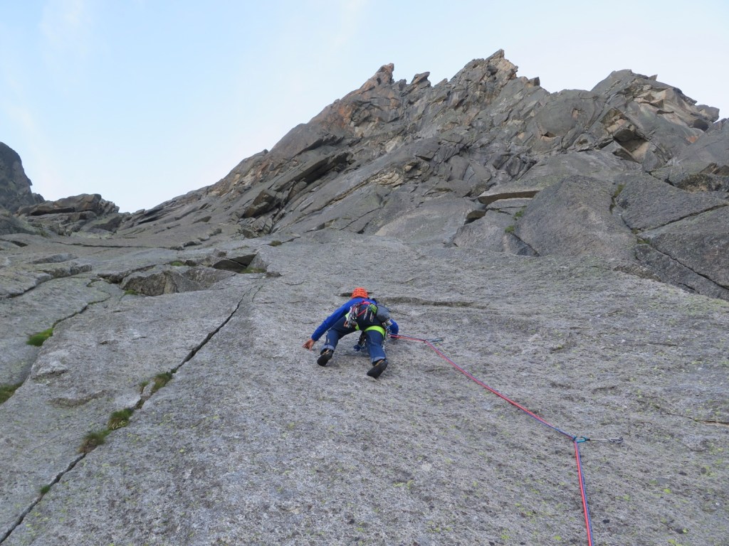 Les longueurs en 6a des dalles du bas, on avance rapidement. J’ai pour habitude de grimper vite dans mon niveau, mais avec cette comète venue de Saint Gervais j’avais presque l’impression de trainer !