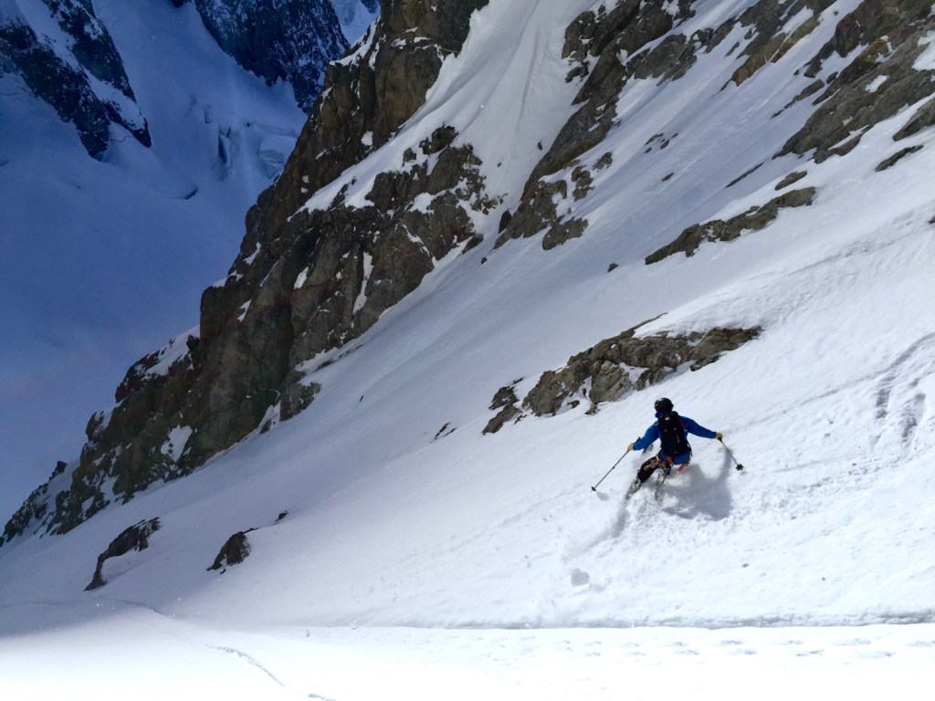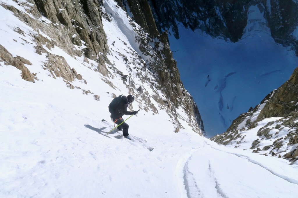 Le couloir étant orienté SW, j’espérait que nous y trouverions de bonnes conditions de neige froide, avec le soleil bas à cette époque. J’avais été au couloir SW de la brèche Puiseux quelques jour auparavant, où la skiabilité était excellente. Malheureusement il n’y a pas de Gent du Géant pour cacher le soleil, et le haut du couloir avait bien chauffé. Ce couloir est un véritable four, propice aux chutes de pierres. Casque obligatoire, le mien s’en rappelle encore !