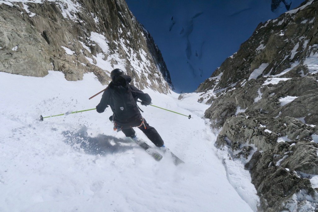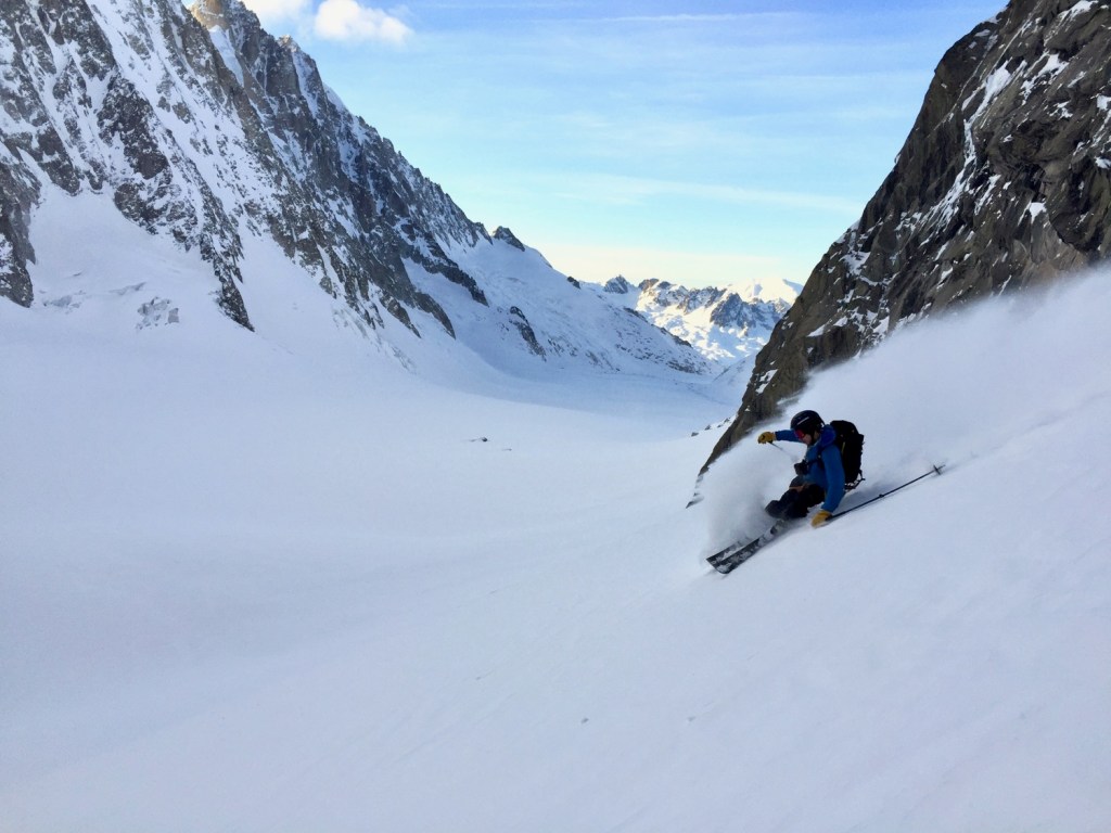La partie basse du couloir est en neige froide et poudreuse, et nous permet de lâcher un peu les chevaux.