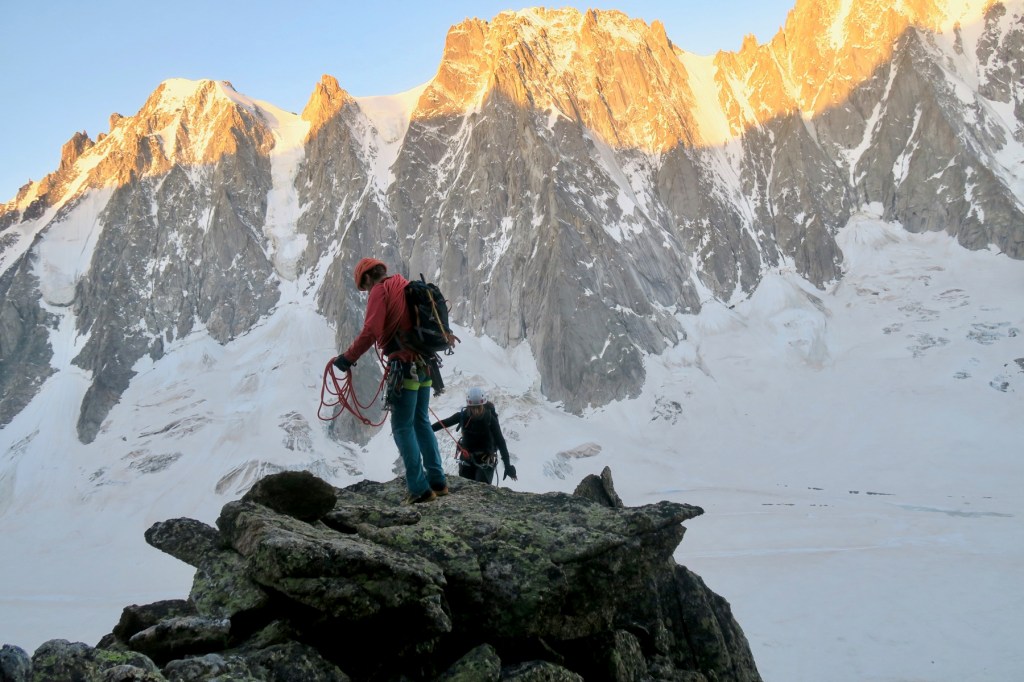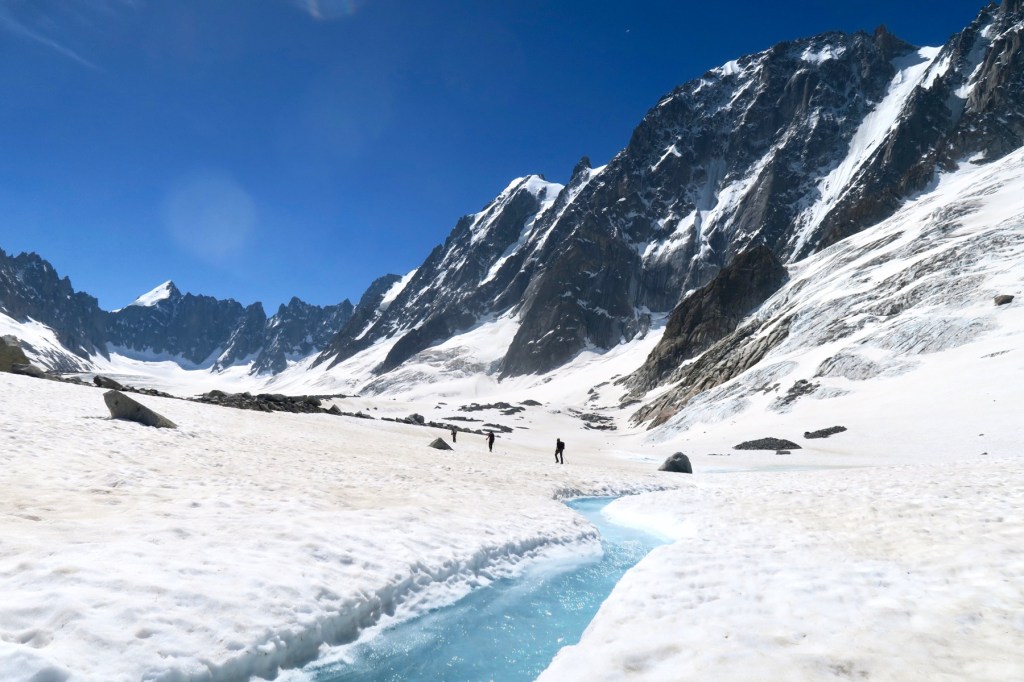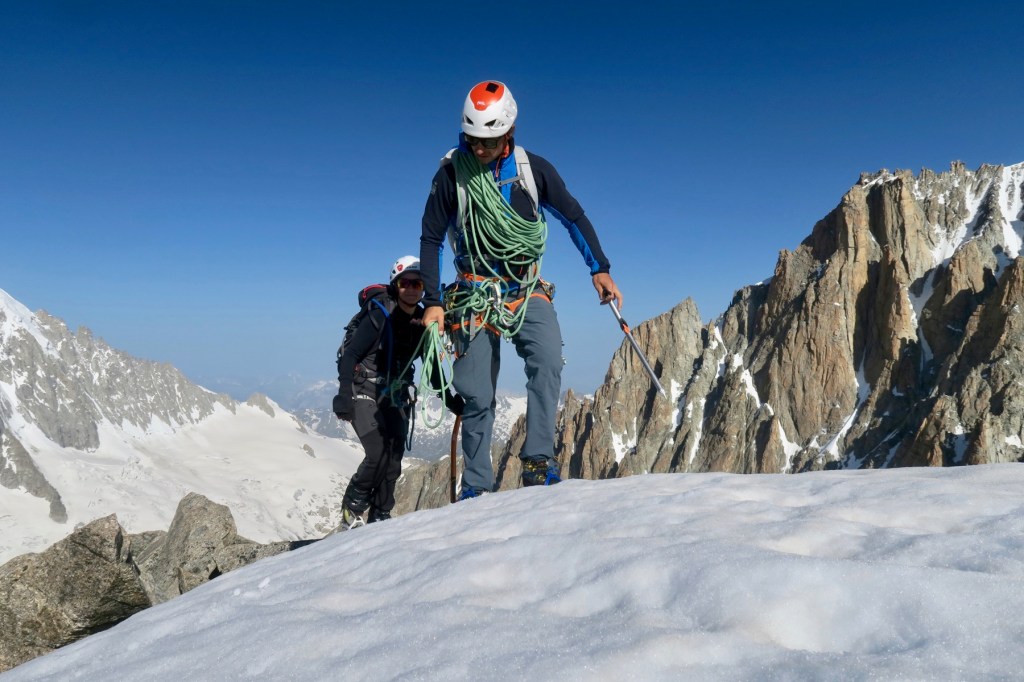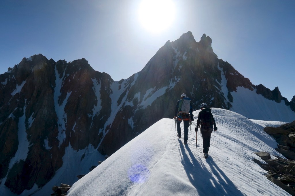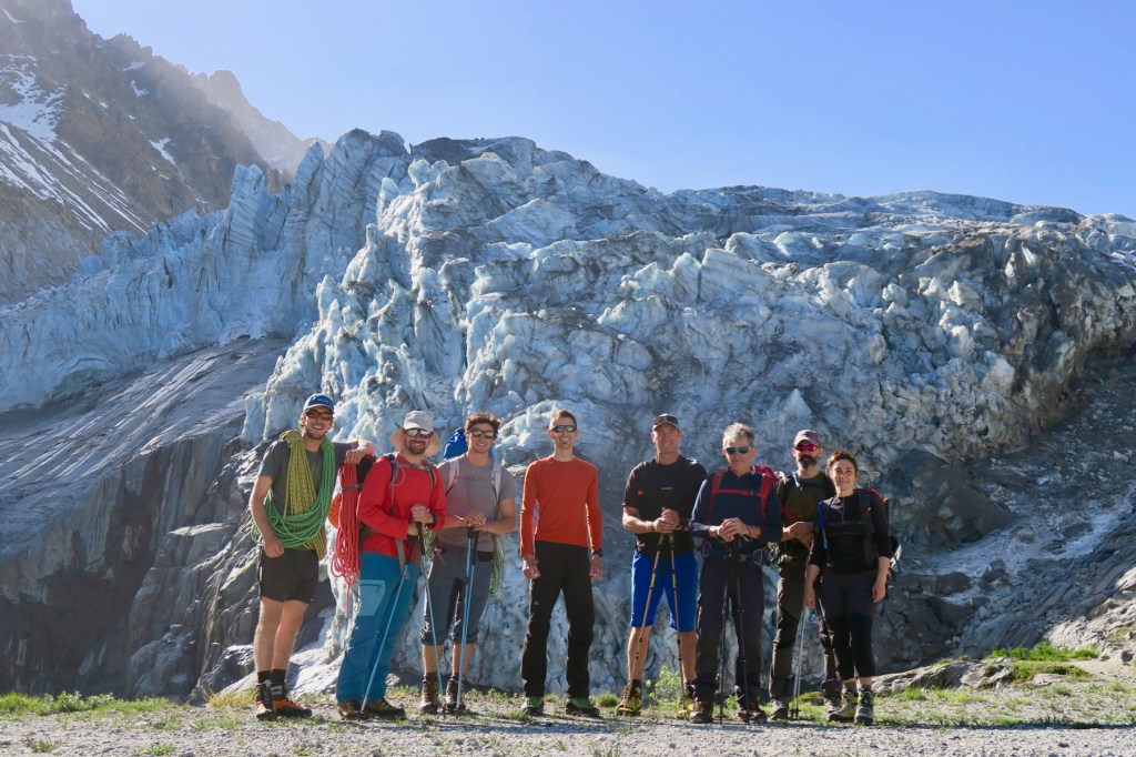 Pour la dernière semaine de formation du stage d’Aspirant Guide 3, nous avions à notre charge l’encadrement d’un groupe de clients cobayes, dernière épreuve avant d’être lachés dans la nature en tant que jeunes Aspirants Guides. Encadrés par Pierre Rizzardo, avec la compagnie de Jordi Noguere, Julien Mondonet, et nos clients sur-motivés, nous nous rendons au refuge d’Argentière pour échapper à la canicule.