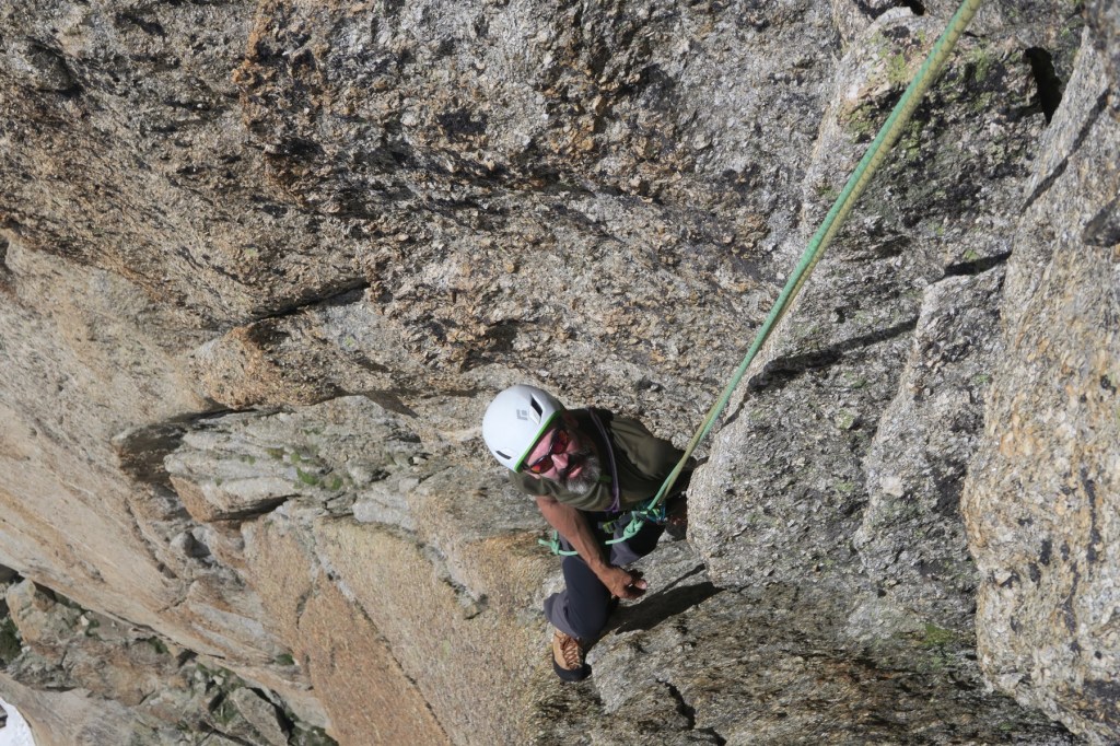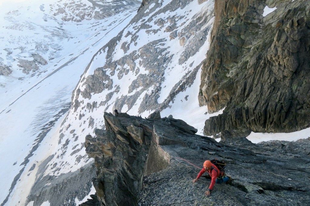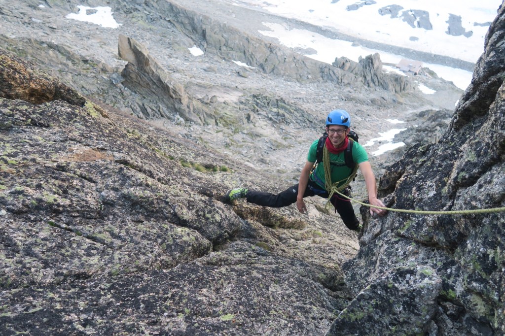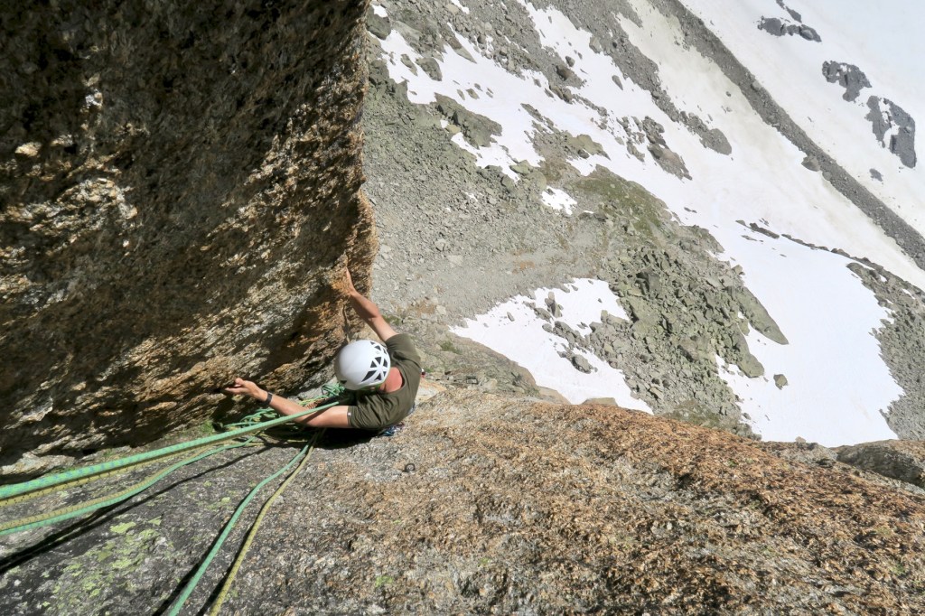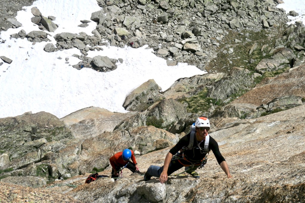 Avec Igor, nous partons pour la voie « Bettembourg de Droite » à l’Aiguille du Refuge. Avec comme cotation maximale 5c, l’escalade est abordable, mais loin d’être facile ! Aucun point en place, des grandes longueurs en fissure/renfougne, bref du bon V+ à l’ancienne.