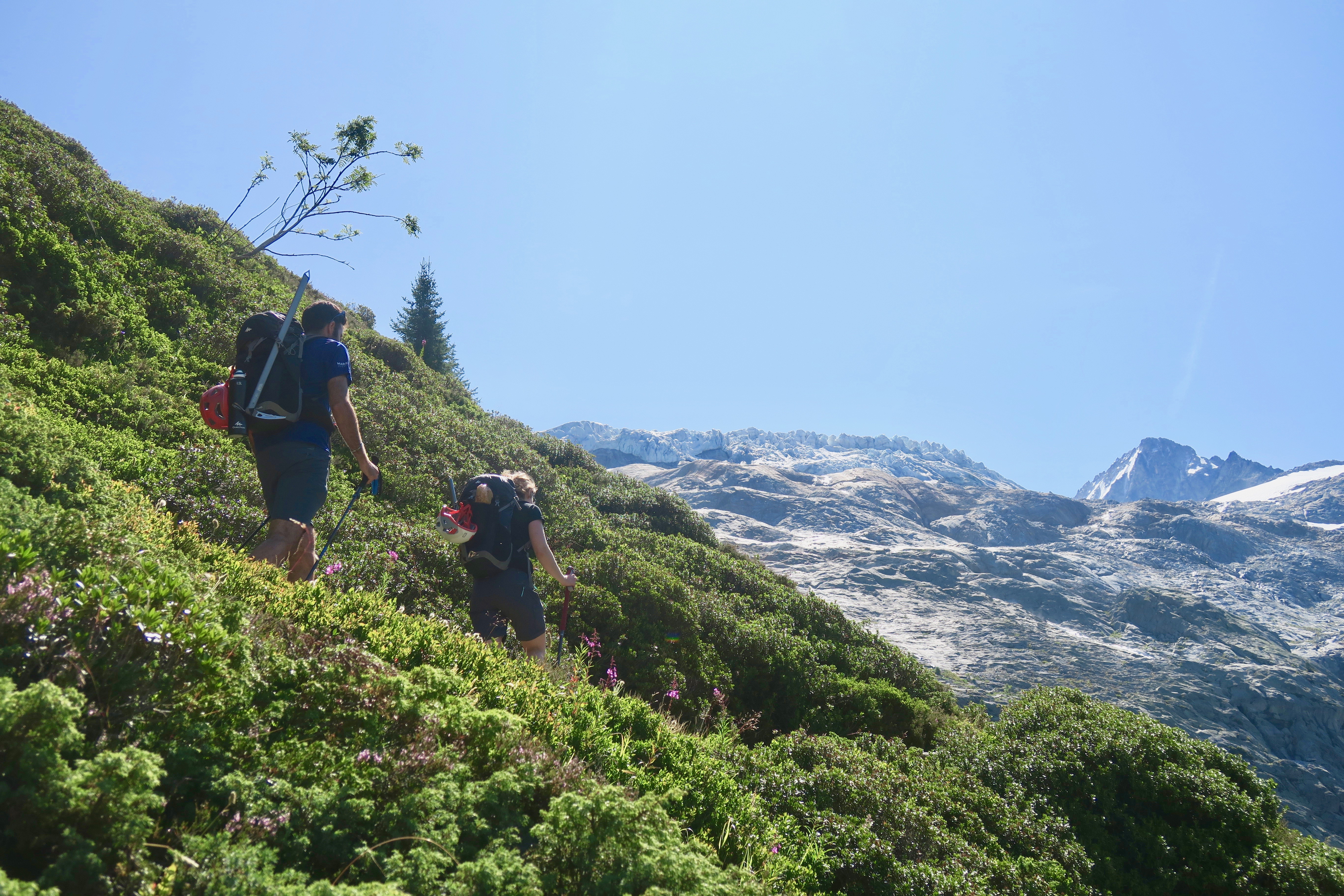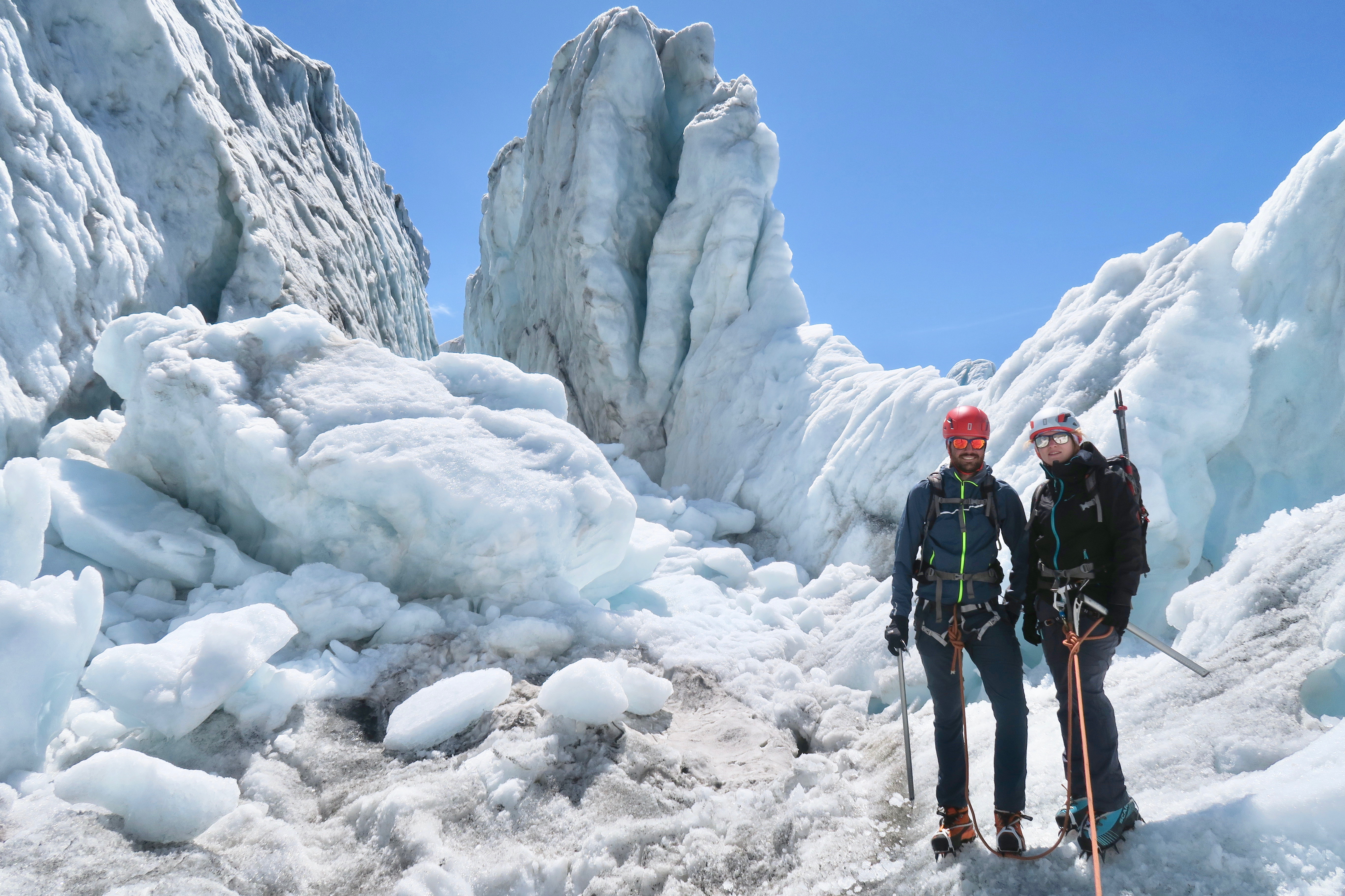 4 Août 2019, Départ du village du Tour à pieds pour Julian, Capucine & moi afin de les accompagner dans leurs premiers pas en Alpinisme. Avant D’arriver au Refuge Albert 1er, nous décidons de faire un petit détour par les lames du glacier pour faire une petite école de cramponnage.