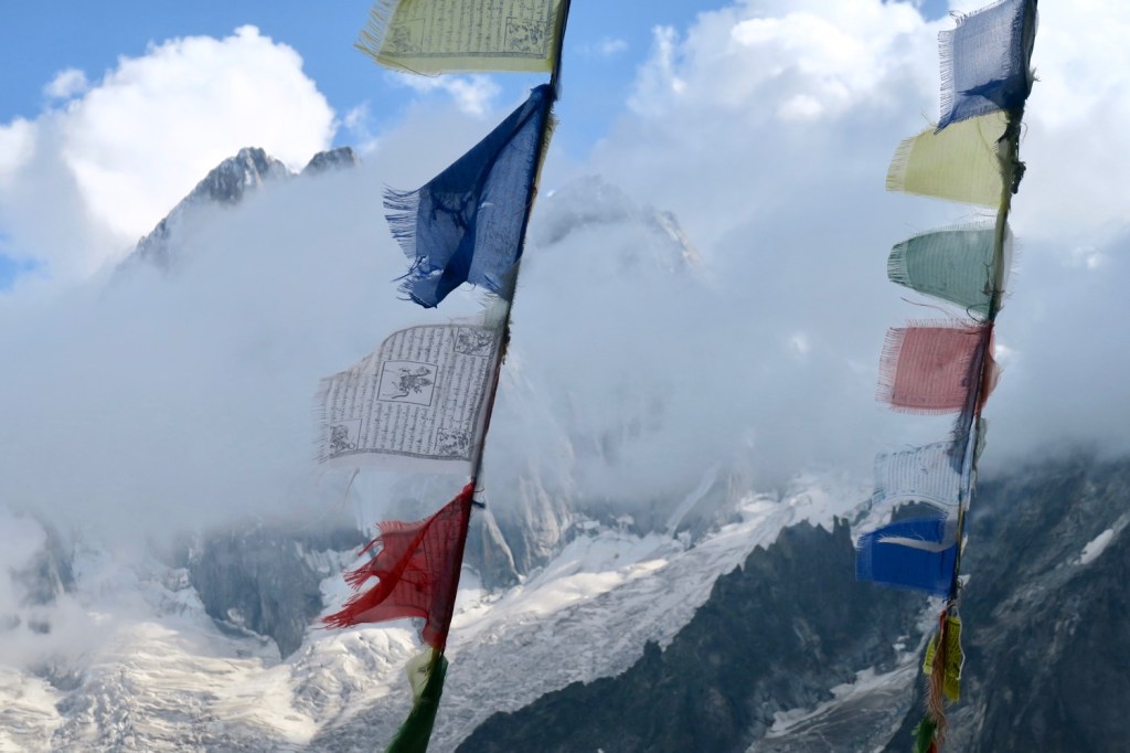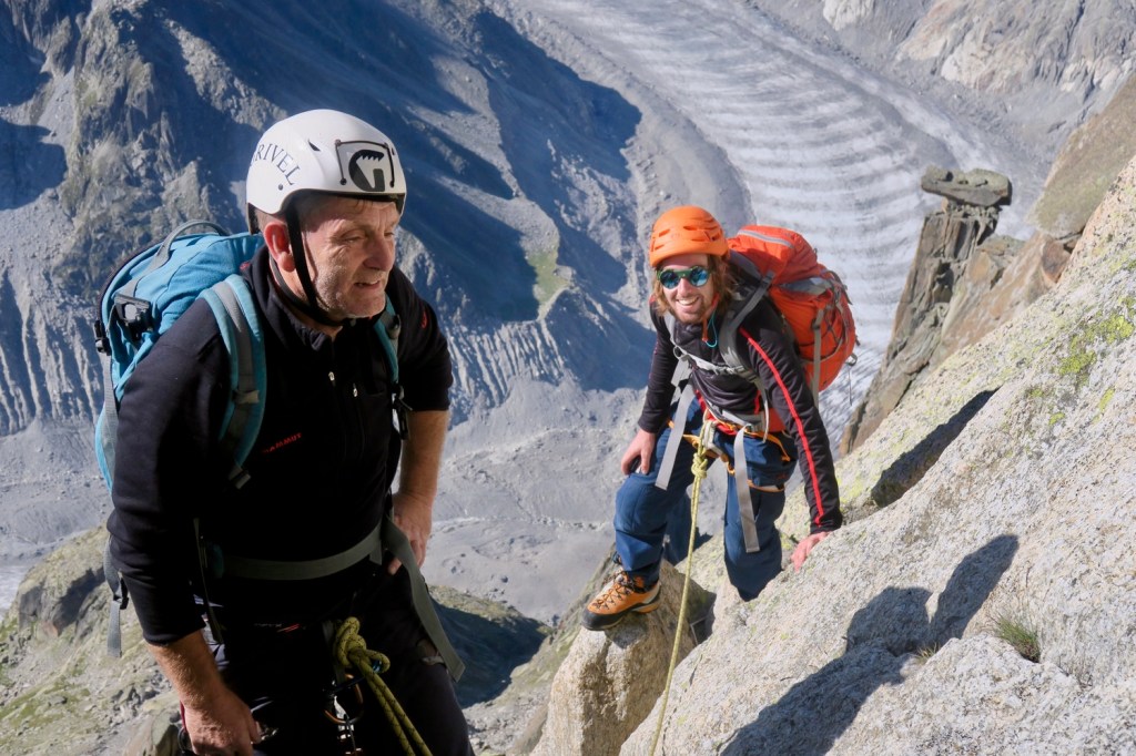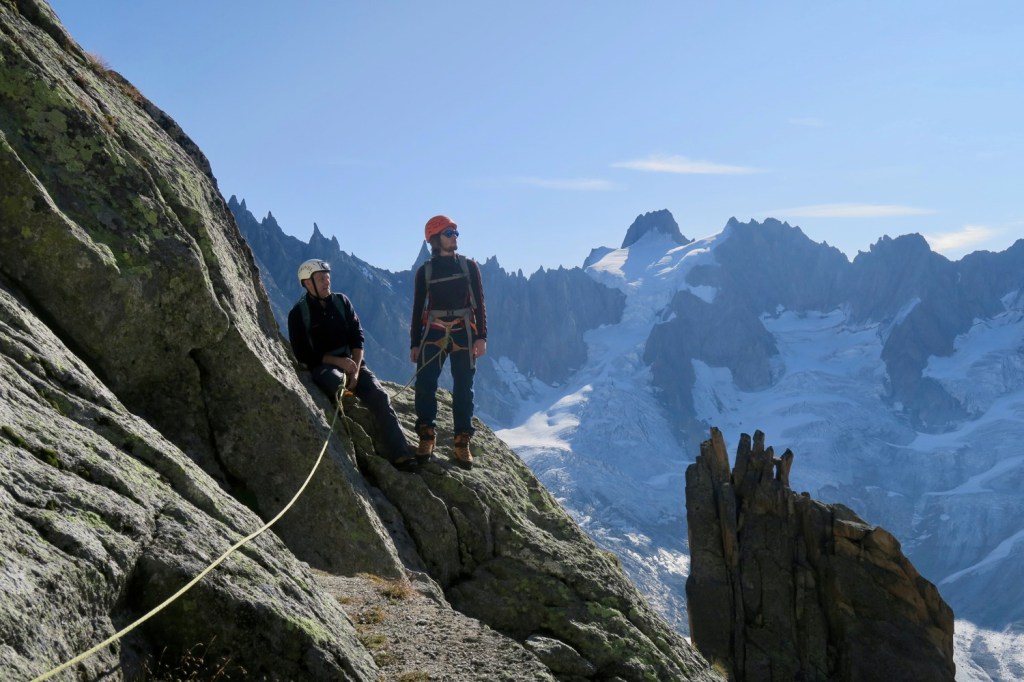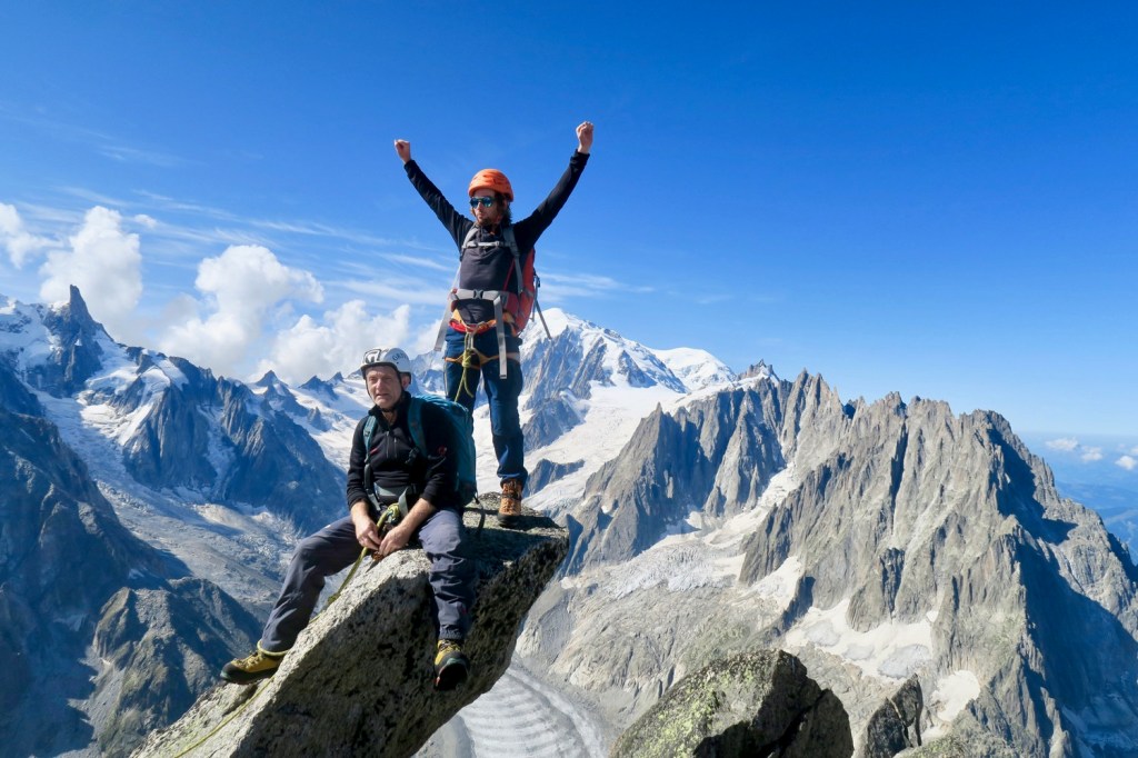 Objectif atteint ! Nous ne partirons pas sans la mythique photo du sommet sur le bloc culminant, qui a des airs de plongeoir vers la mer de Glace..