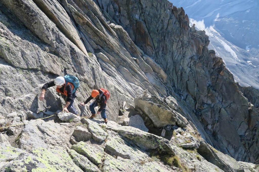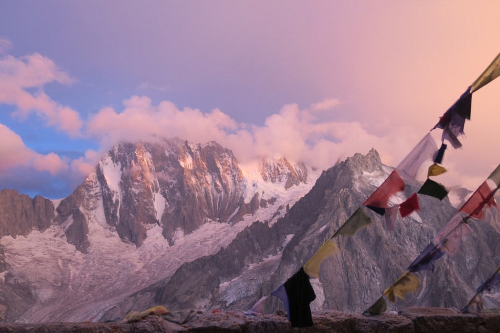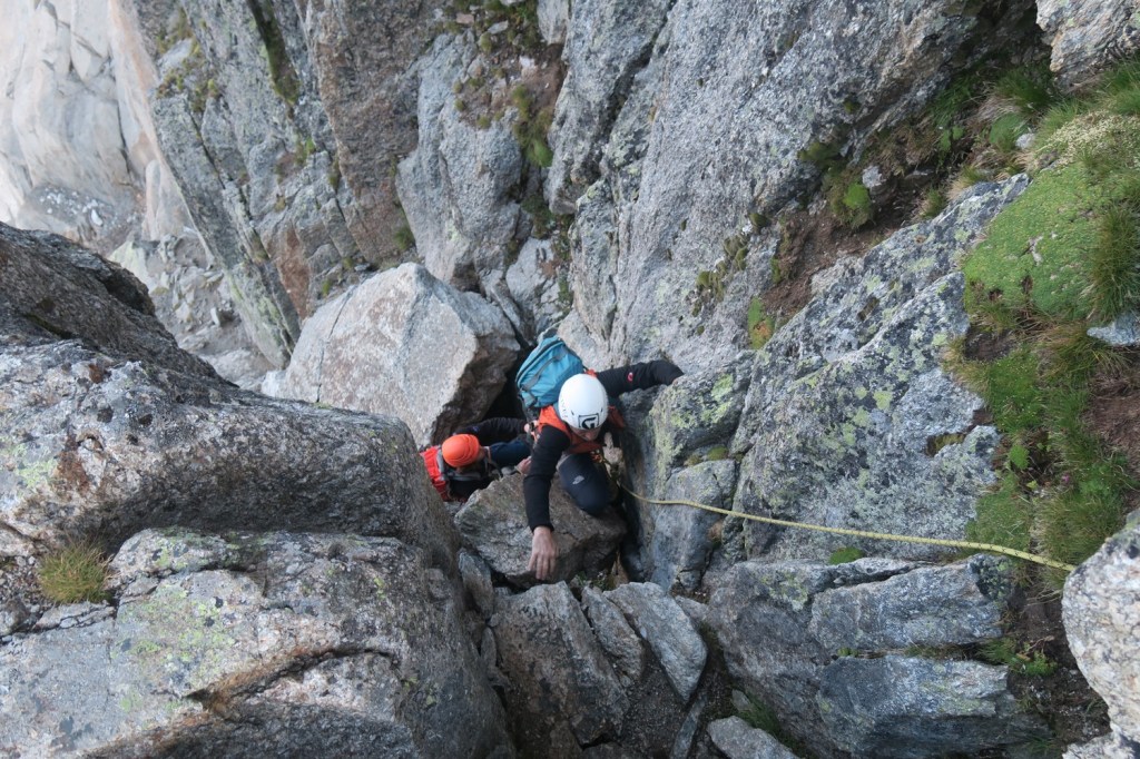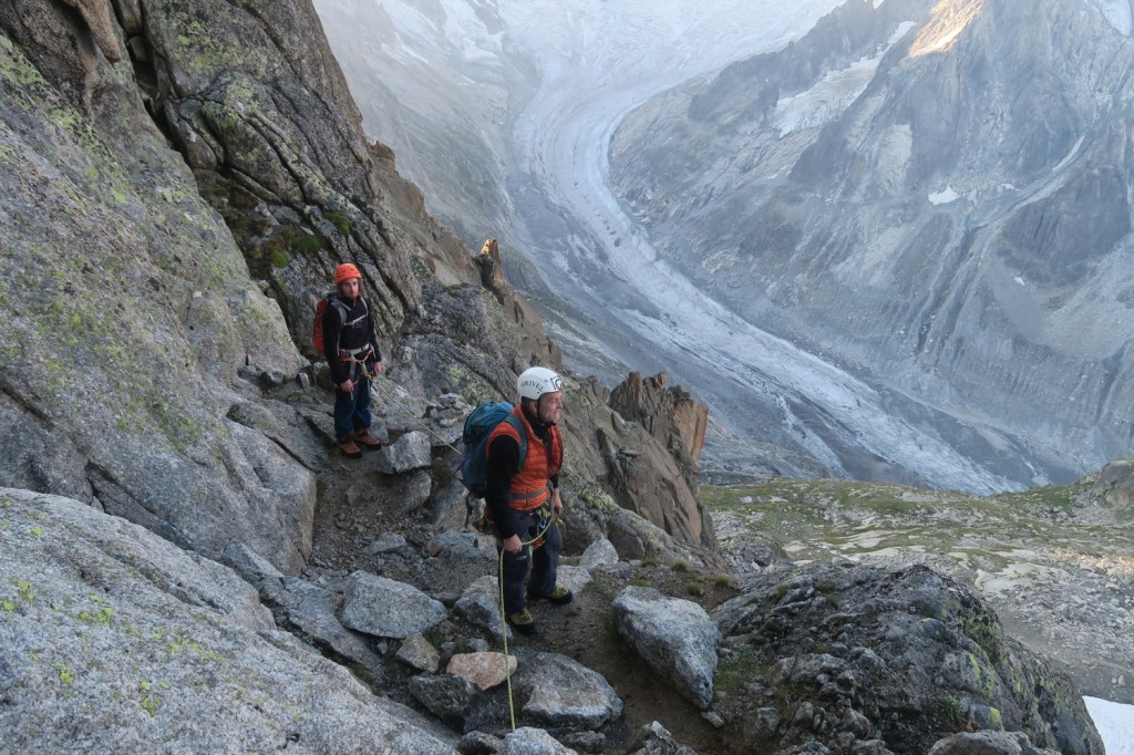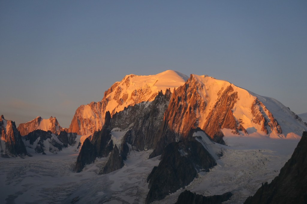 Après une nuit dans ce havre de paix, nous partons de nuit, de manière à arriver à l’attaque avec les premières lueurs du jour. Le lever de soleil sur le Mont Blanc et les Grandes Jorasses est déjà une belle récompense.