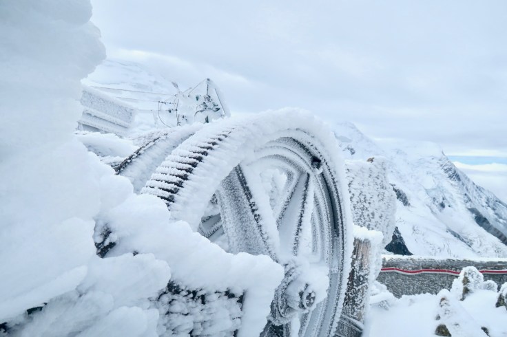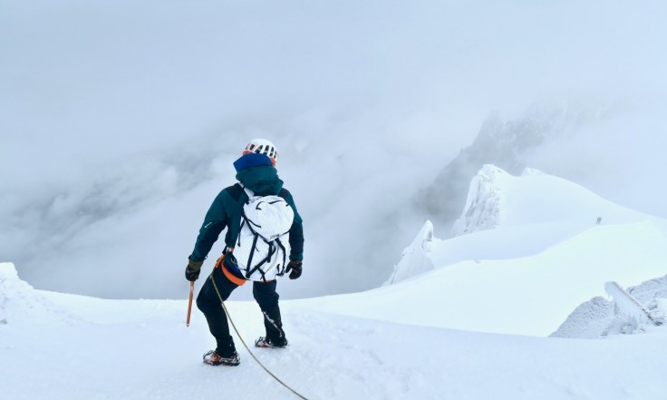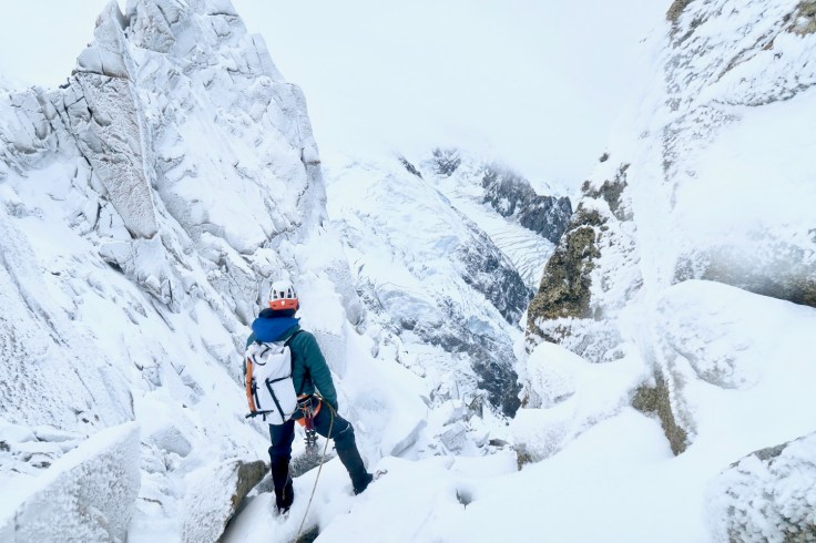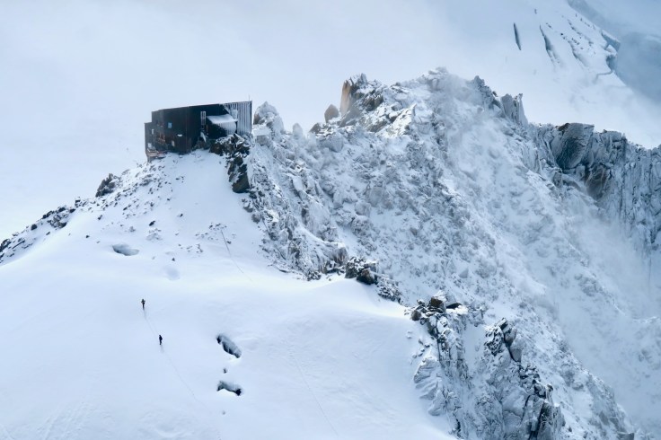 Deuxième jour avec l’équipe de Mountain Hardwear, cette fois ci en comité plus réduit… La météo a été capricieuse, et l’ouverture de l’Aiguille du midi tardive. Rendez vous fixé pour la première benne, qui sera trois heures plus tard que prévu… On aura eu le temps de boire quelques cafés et de réviser quelques manips de corde avant d’enfin voir notre patience récompensée.
