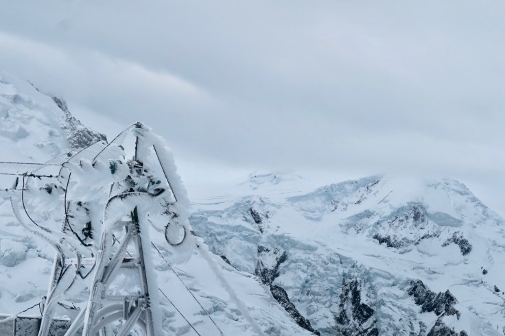 Nous sommes quasiment seuls dans la première benne, une ambiance incroyable, aux couleurs de givre, nous accueille. Direction l’arête des Cosmiques, que j’ai eu l’occasion de parcourir de nombreuses fois, mais je doit dire que cette fois ci était de loin la plus belle.