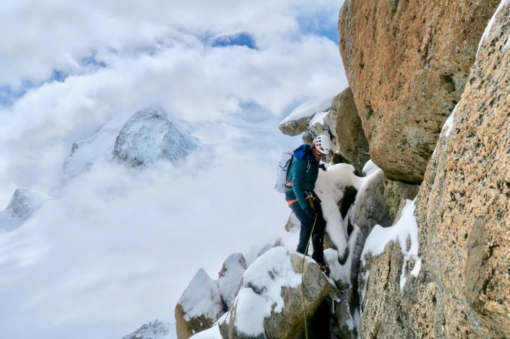 Premières traces à la descente de l’arête de l’Aiguille, éfilée par le vent ce jour là, dans une neige profonde.. loin d’être facile !