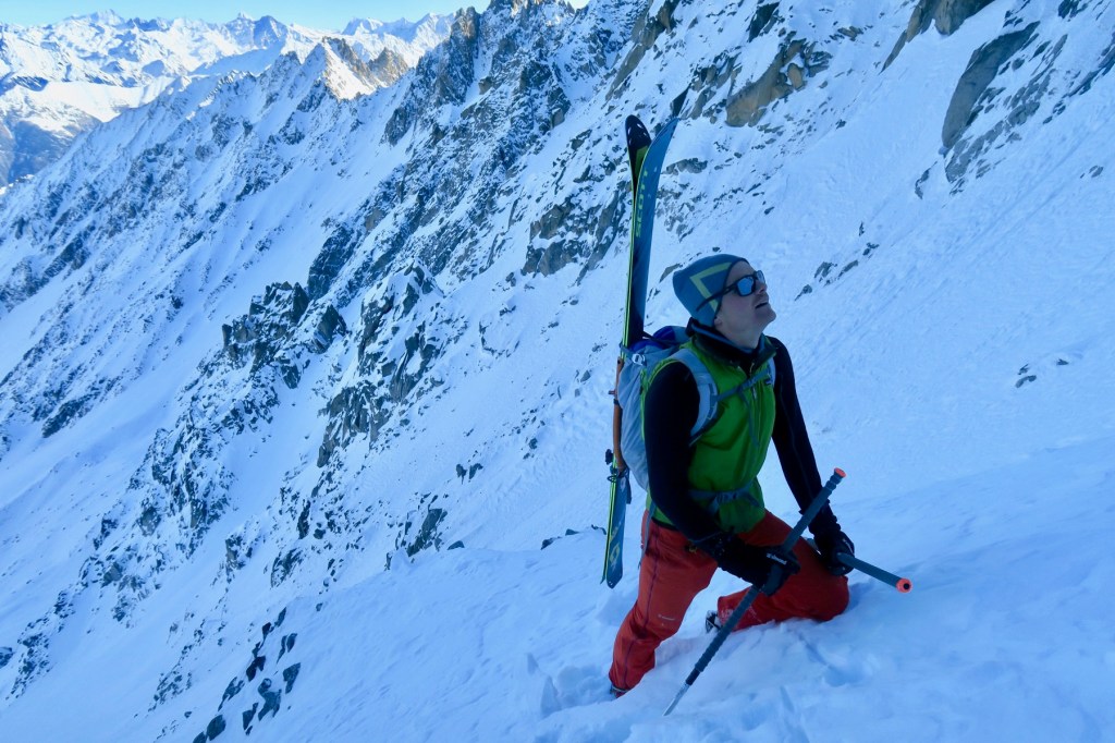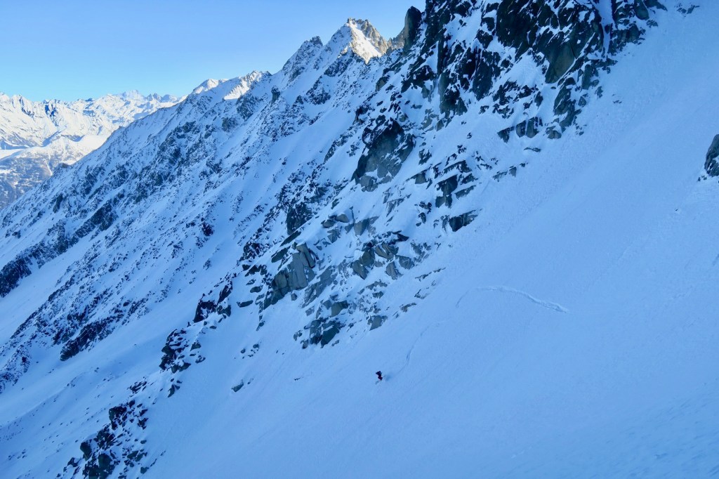 Niché au fond du Val d’Arpette dans le valais suisse, l’aiguille d’Orny offre un grand choix de couloirs orienté Nord, parfait pour un début de saison. C’est la deuxième fois que je me rend dans ce vallon pour skier, cette fois ci avec le copain Pierre-i Mehdi en espérant y trouver une neige froide et préservée du vent. Notre choix se porte sur l’esthétique couloir Nord de la Petite Pointe d’Orny, la ligne la plus à droite.