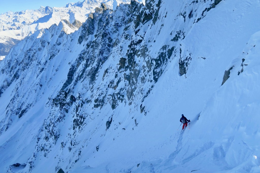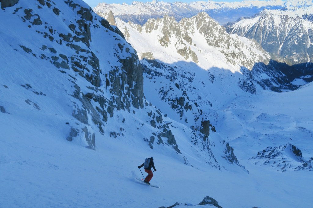 Au final petite déception, la neige dans couloir a déjà bien été travaillé par le vent, un peu irrégulière. Rien de bien grave cela dit, la partie haute du couloir nous réserve une neige plus agreéable à skier, et ça fait plaisir de retourner en montagne sur les skis.