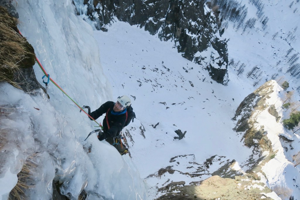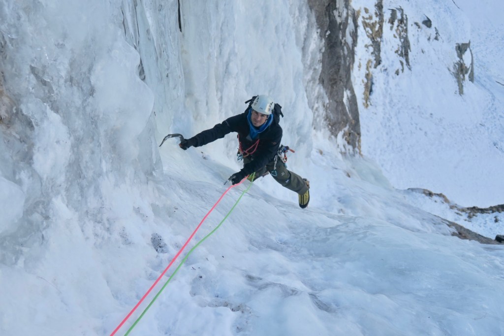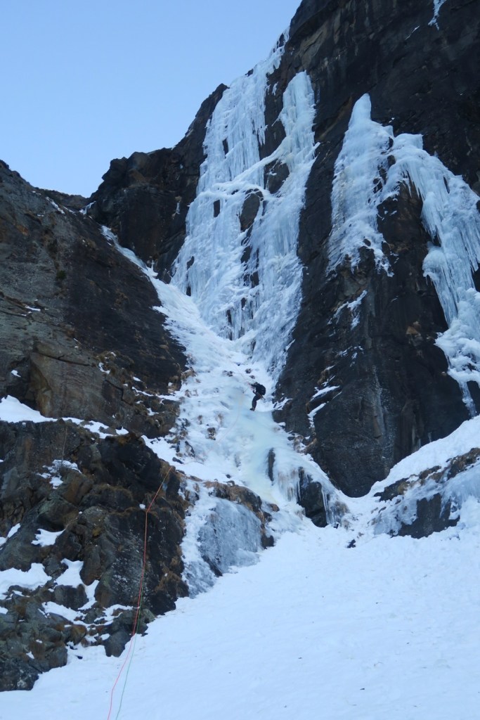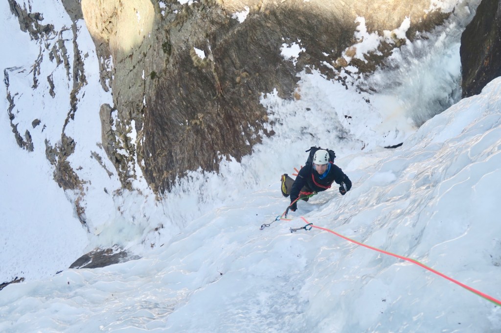 Les choses sérieuse commencent, on part directement dans le vertical avec une glace très dure et cassante, très peu de passage. On a repéré une petite terrasse en milieu du mur pour faire un relais intermédiaire, bien que la longueur peut s’envisager d’une traite. Mais 50m dans du 5-5+ non tracé et avec une glace difficile à grimper, nous n’étions pas encore prêts en ce début de saison.