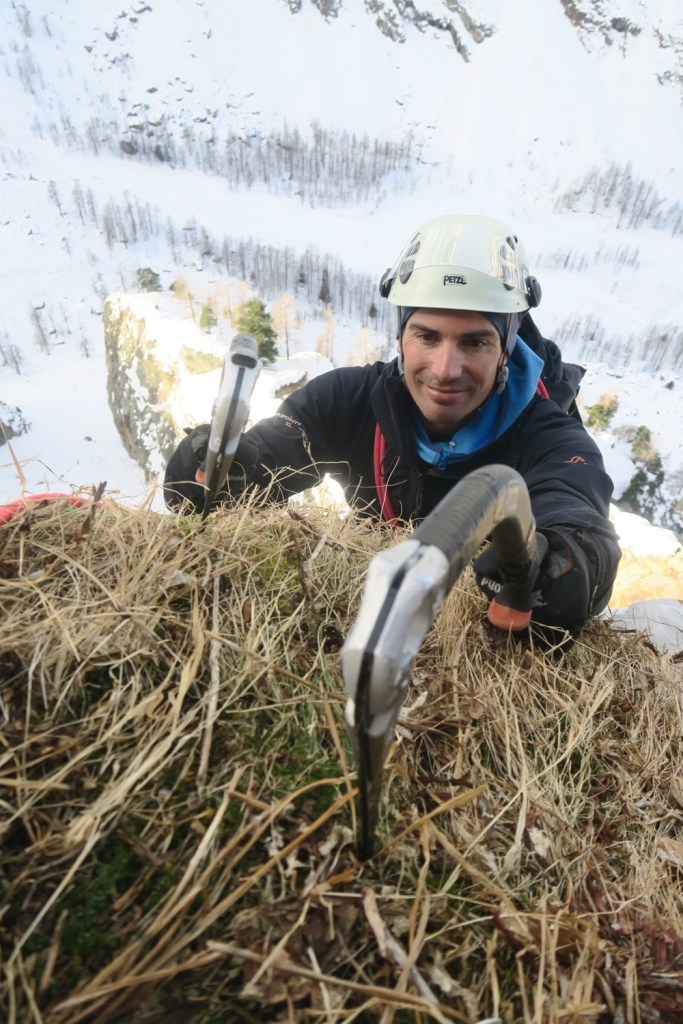 Après un rétablissement dans les touffes d’herbe gélées, on arrive sur une longueur de transition avant le cigare final. je fait rapidement cette longueur pour laisser la dernière belle longueur à Seb.