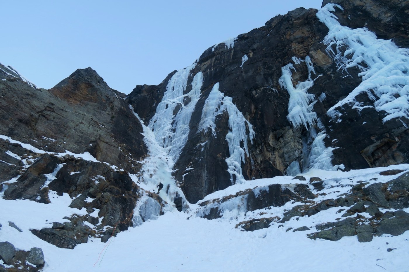 Les choses sérieuse commencent, on part directement dans le vertical avec une glace très dure et cassante, très peu de passage. On a repéré une petite terrasse en milieu du mur pour faire un relais intermédiaire, bien que la longueur peut s’envisager d’une traite. Mais 50m dans du 5-5+ non tracé et avec une glace difficile à grimper, nous n’étions pas encore prêts en ce début de saison.