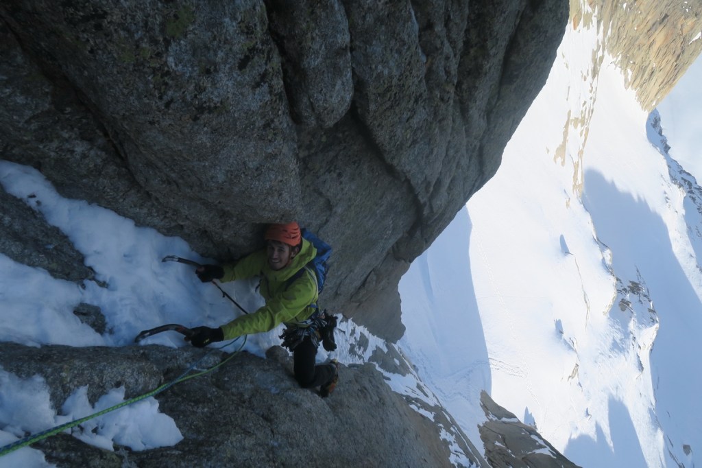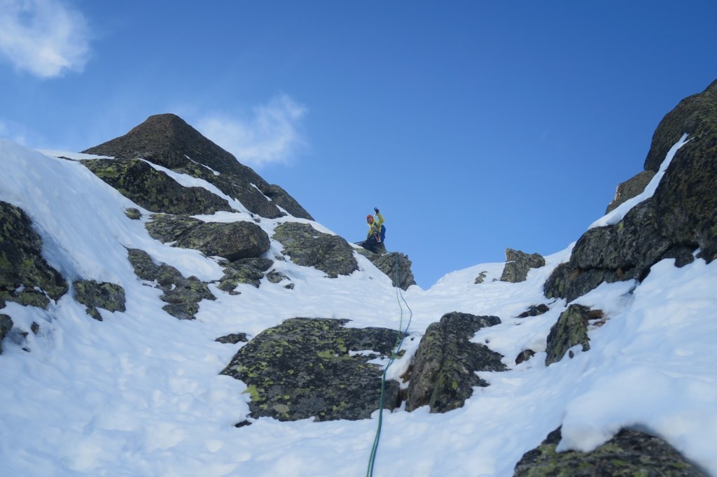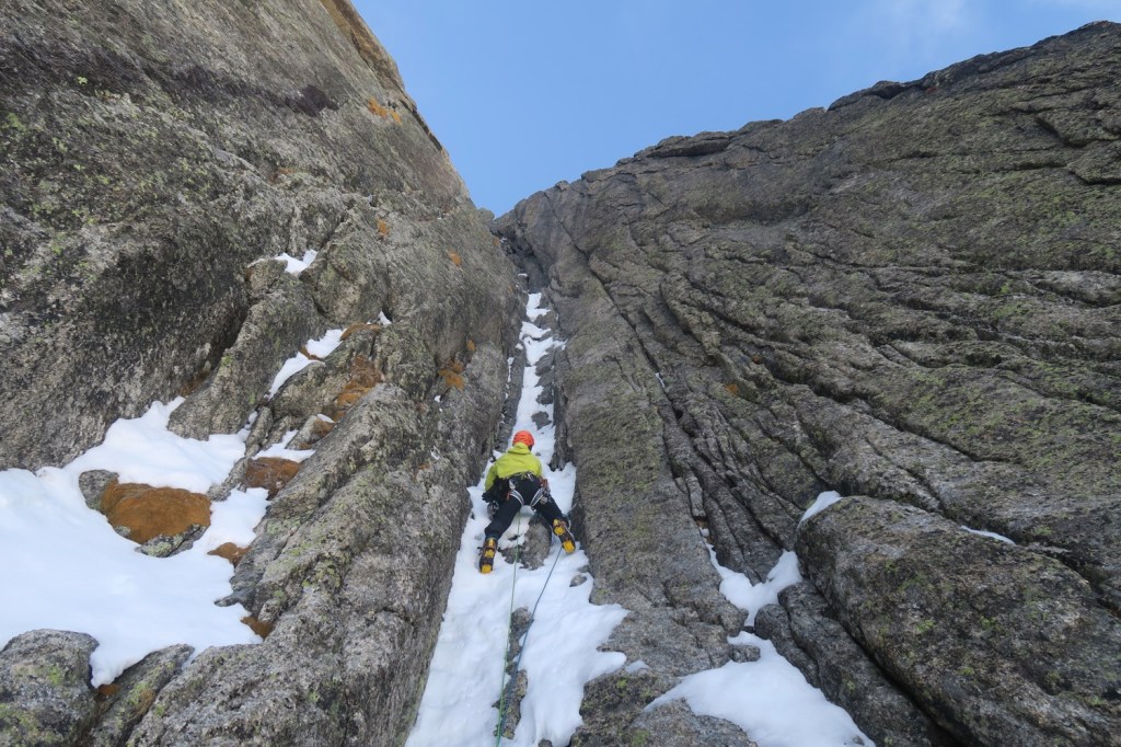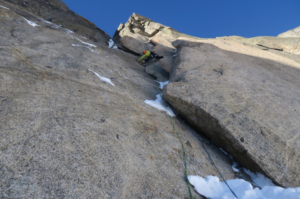 Je prends le relais pour une belle longueur de dièdre en neige couic, avec des petite interruptions dans le plaquage pimentant un peu la longueur, avec de très bonnes protections dans le rocher si l’on a suffisamment de matériel.