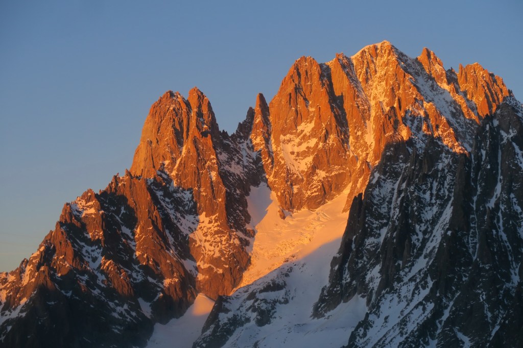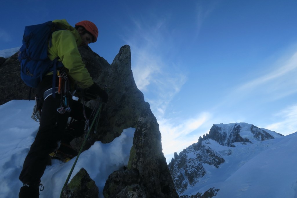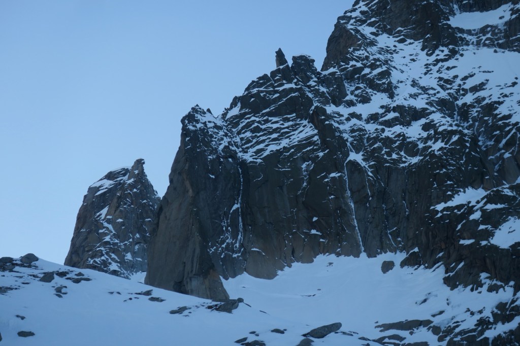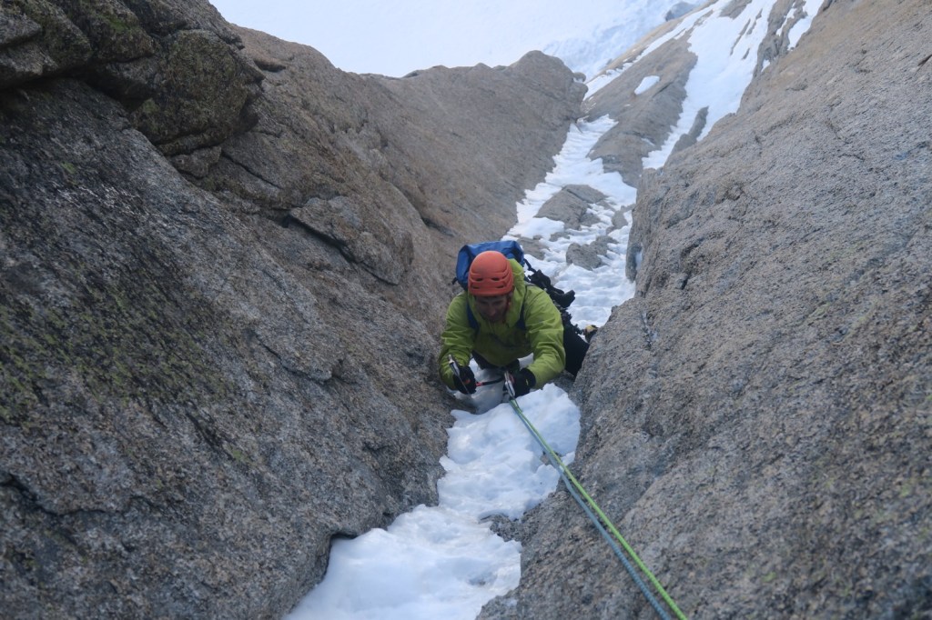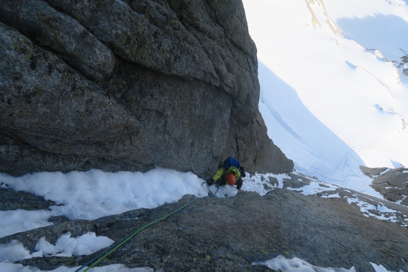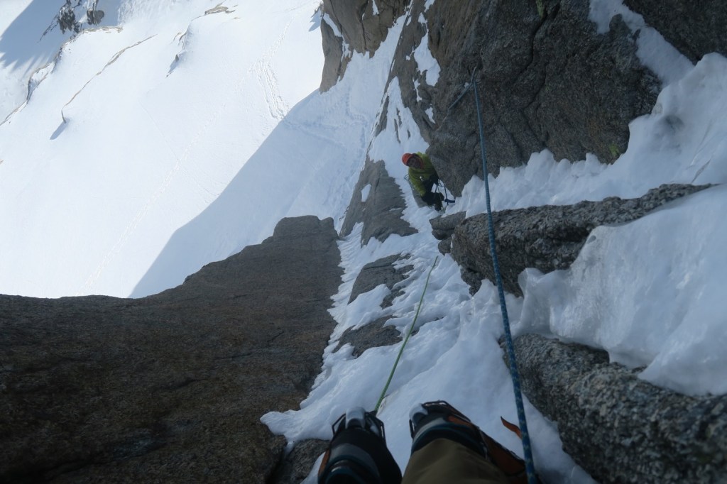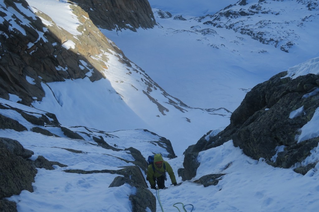Pour optimiser le déplacement, nous choisissons une petite goulotte de 250m, juste au dessus du refuge du Requin. La ligne sort à la brèche de la pointe 2977 de la Dent du Requin, une ligne pure et esthétique.