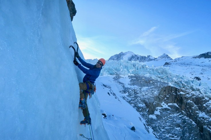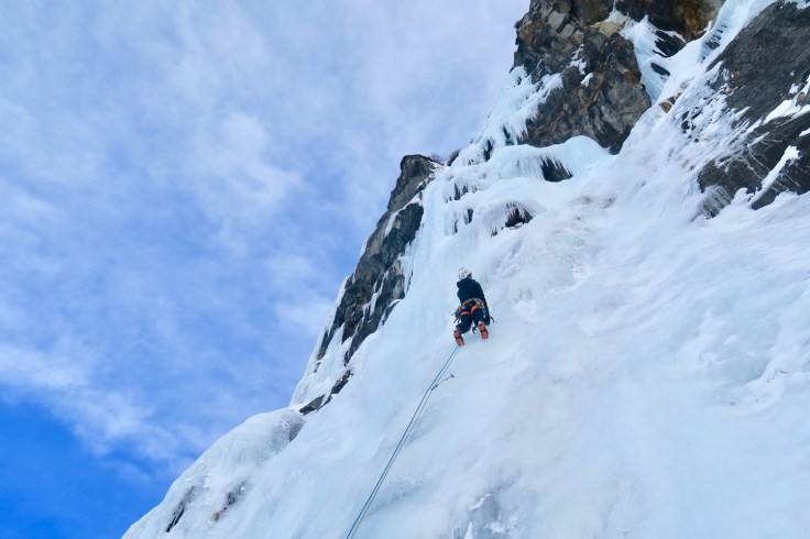 Cette ligne me faisait rêver depuis un moment, même si elle ne présentais pas de difficultés particulières. Pas question d’aller ailleurs pour ma première visite en ces lieux, je ne laisse pas le choix à mes collègues et part devant… L’équipe du jour sera constituée de Clovis Paulin, l’homme qu’il vous faut pour tailler les glaçons de votre pastis en un temps record, et d’Adèle Milloz, ex championne de ski Alpinisme et véritable couteau suisse, idéal à avoir sous la main…
