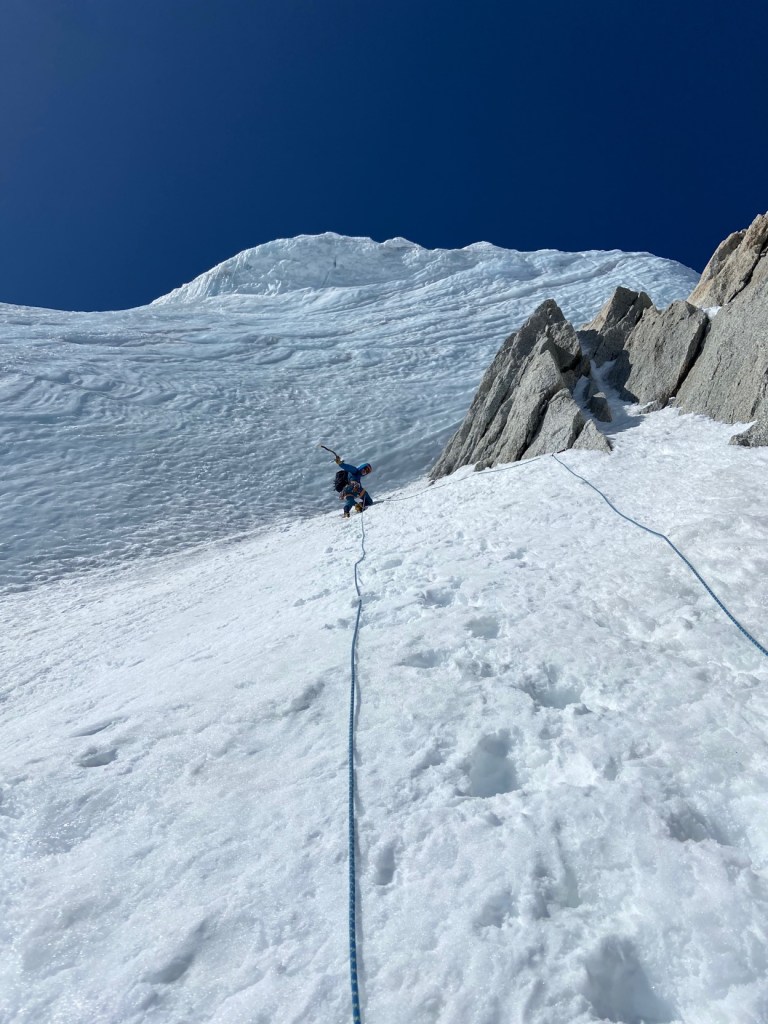 Après une partie de corde tendue où la glace n’est pas loin, nous rejoignons le fil de l’éperon qui est tout en neige. D’un commun accord nous décidons d’enlever la corde, prête à être ressortie rapidement si la glace refait son apparition. L’altitude commence à se faire sentir, le mal aux jambes aussi. Mais le sommet est proche.