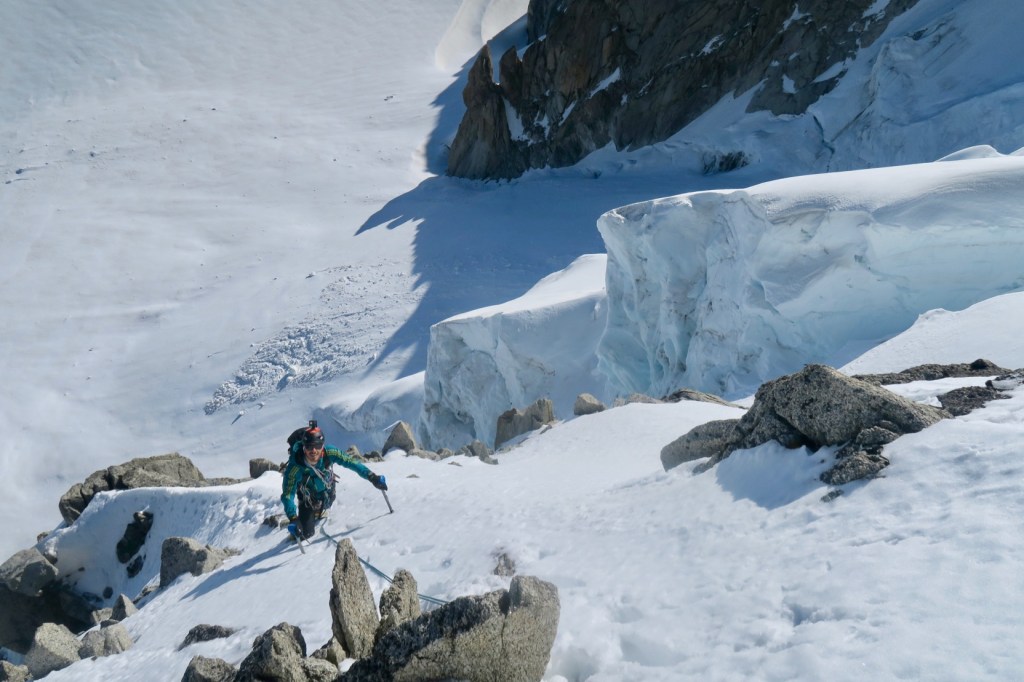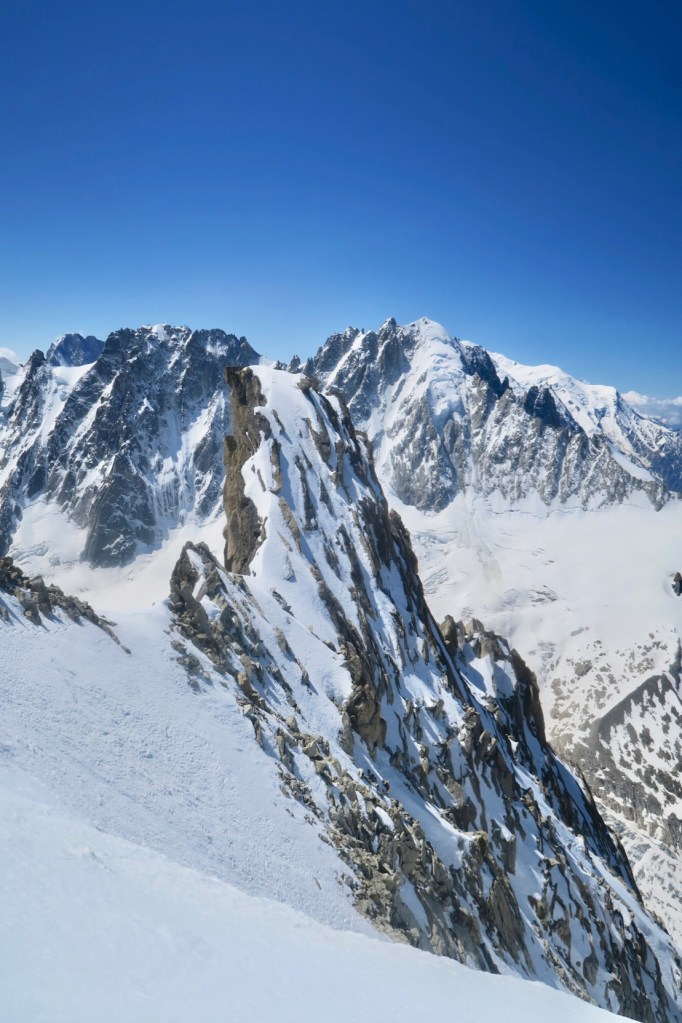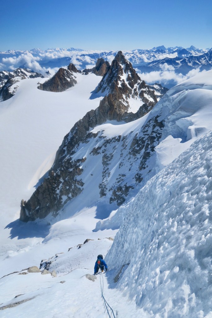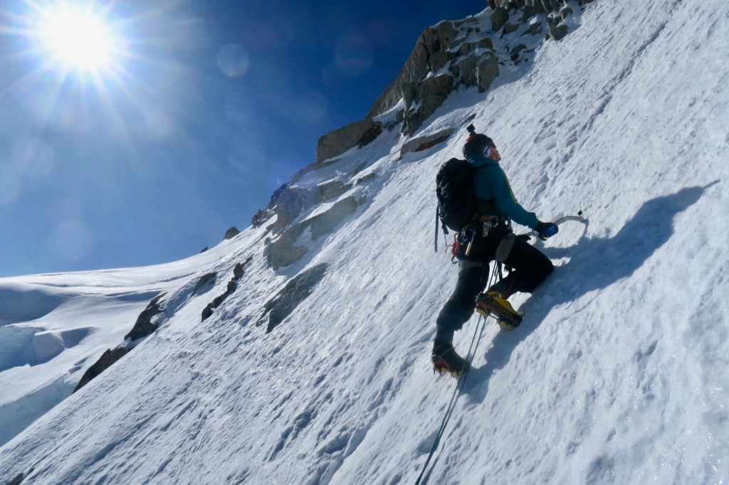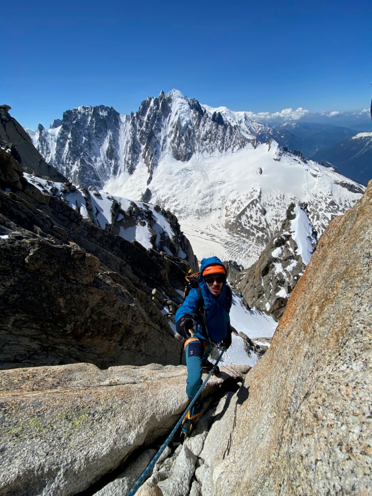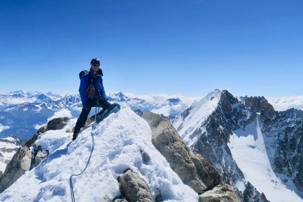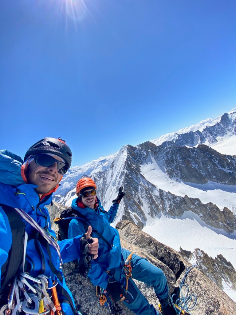 Nous prenons la sortie de gauche et nous rejoignons les derniers mètres de l’arête Forbes pour prendre pied sur le magnifique sommet du Chardonnet. La vue est à couper le souffle.