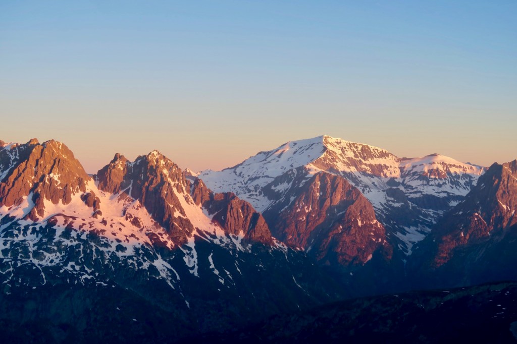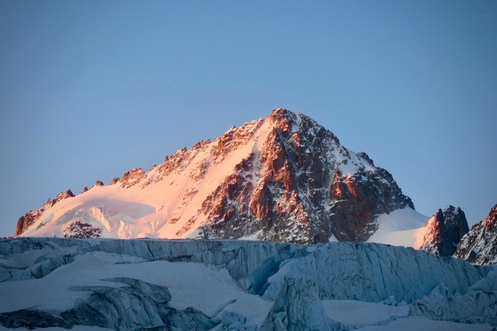 On assiste à un magnifique lever de soleil sur la face nord du Chardonnet qui se dévoile tout juste au dessus des séracs du glacier du Tour. C’est un sommet jugé difficile, ne comportant aucune voie de descente aisée.