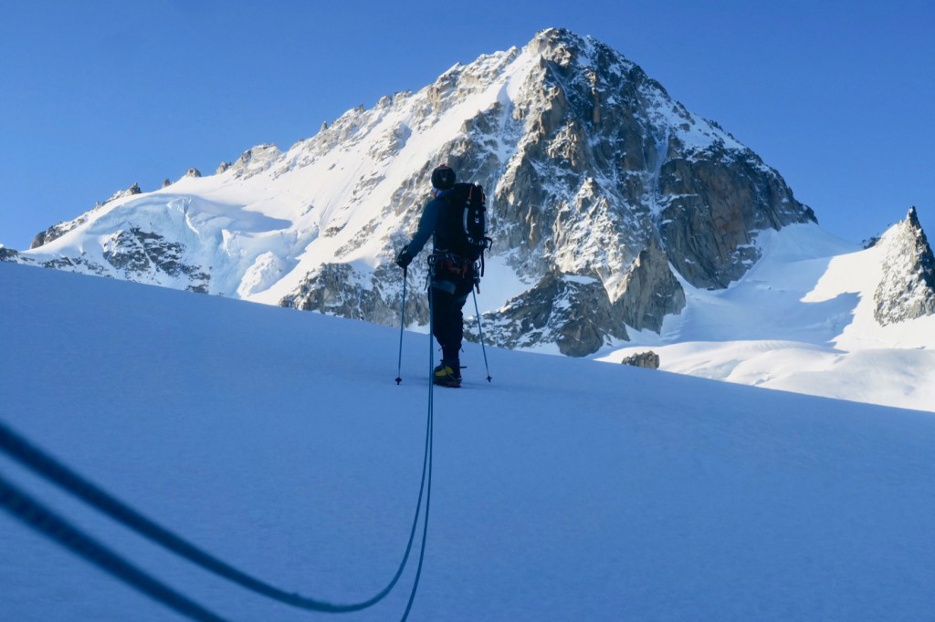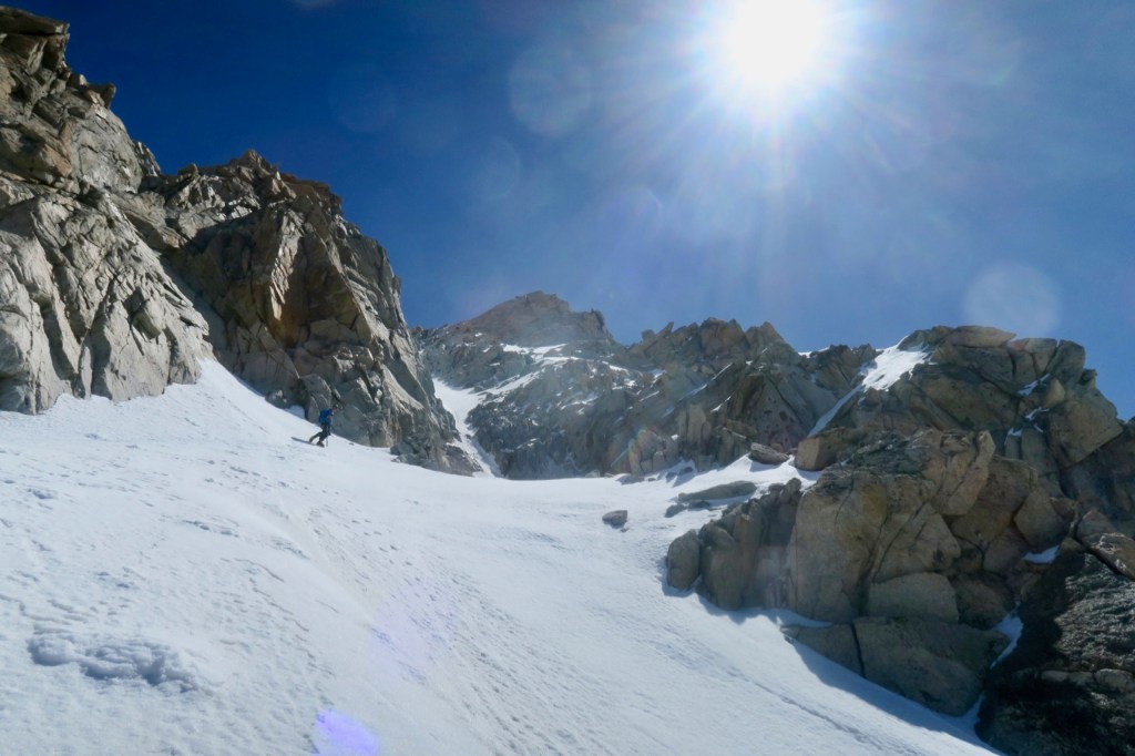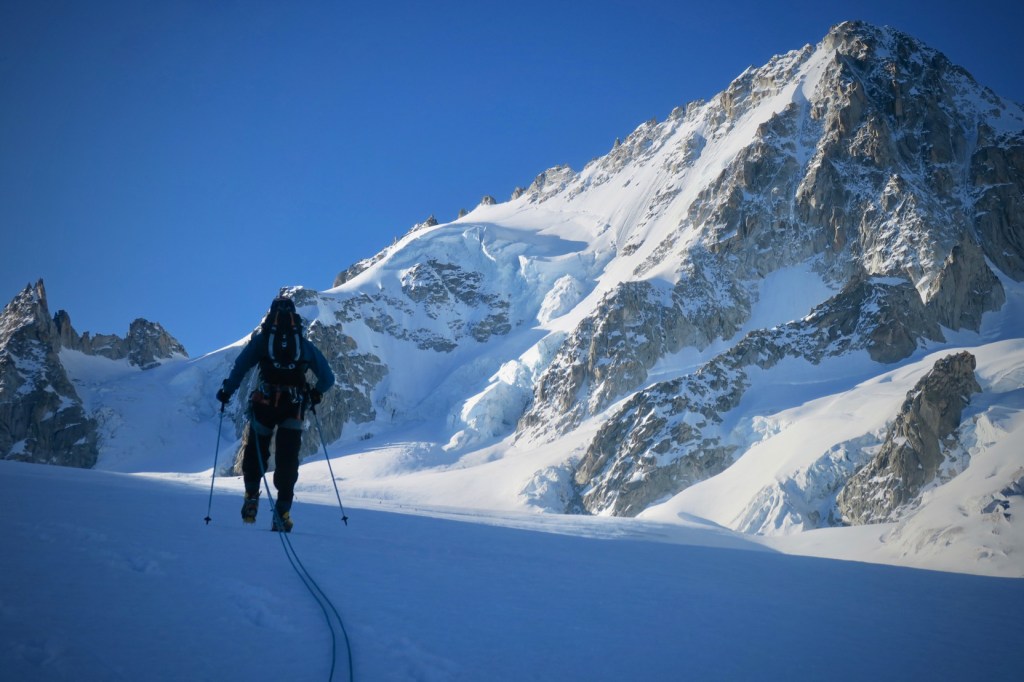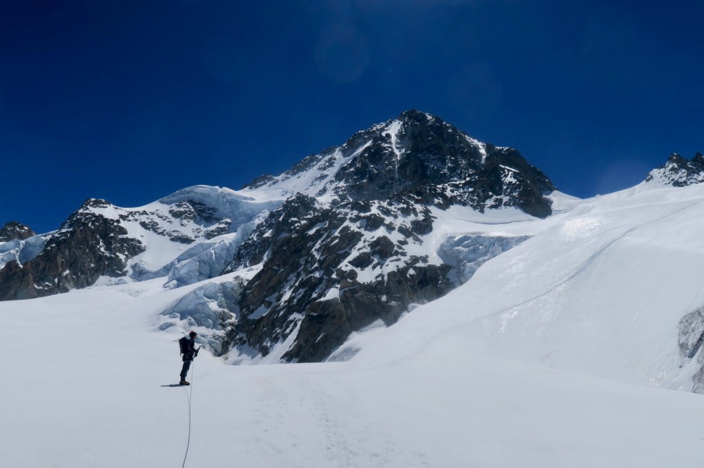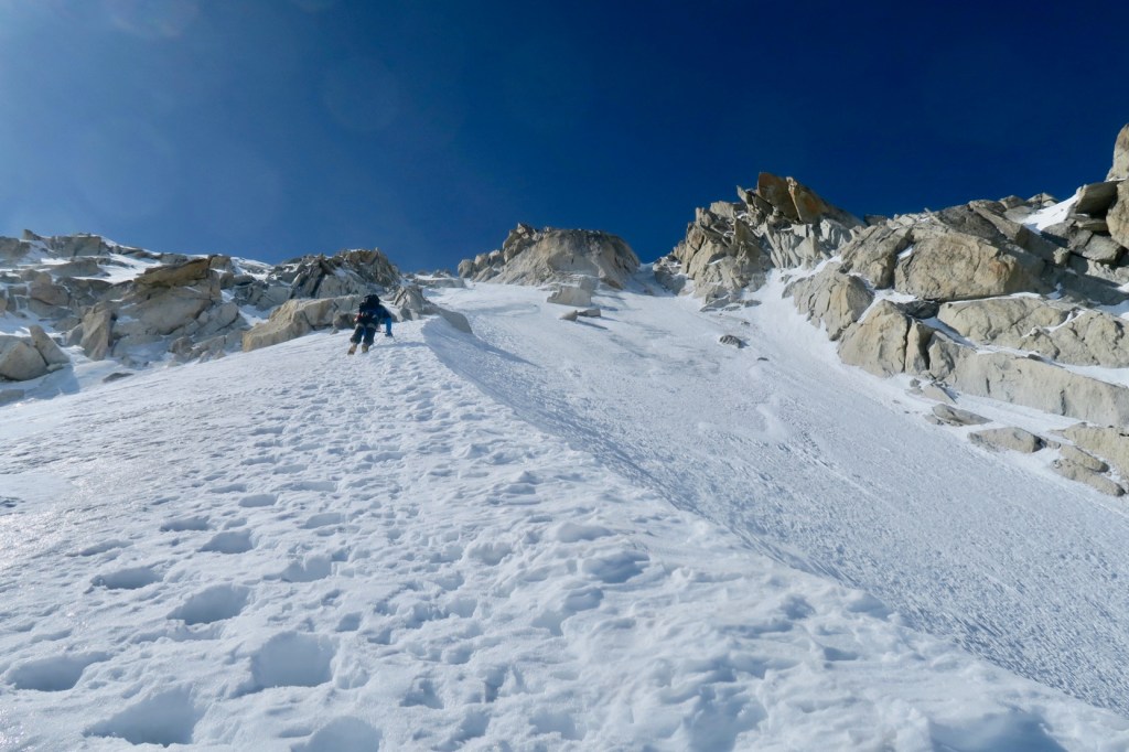 L’approche sur le glacier est assez longue et pénible, mais avec un regel parfait et l’objectif qui se rapproche la pillule passe mieux..