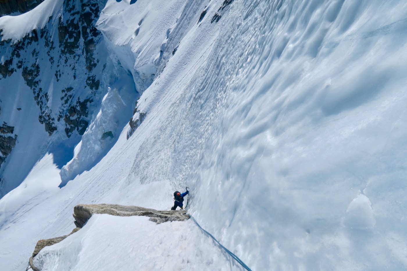 Réputée paumatoire, je l’ai trouvée assez logique, on suit le fil de l’arête sur une centaine de mètres pour rejoindre un large couloir. On entrevoit la scelle neigeuse Adam Reilly, que l’on rejoint par deux courts rappels de 25 m.