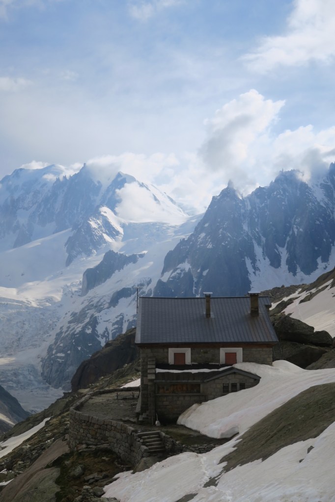 On profite du train du Montenvers pour gagner un peu de dénivelé, et direction le refuge du Couvercle en milieu de journée. Le nouveau refuge étant fermé, ça sera dans l’ancien en mode bivouac. Comme nous sommes encore en période de déconfinement, le bivouac en montagne est interdit, donc on la passera assis à attendre l’heure de départ, à se donner mutuellement des baffes pour ne pas dormir !