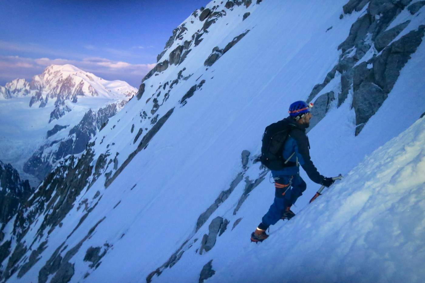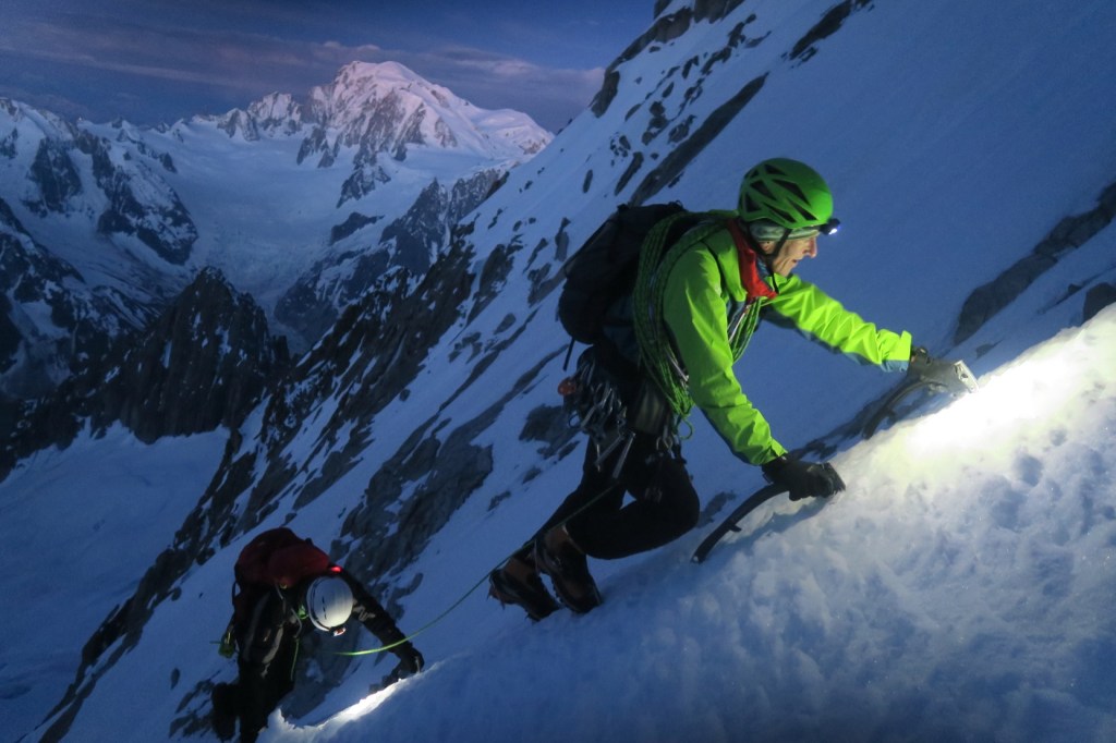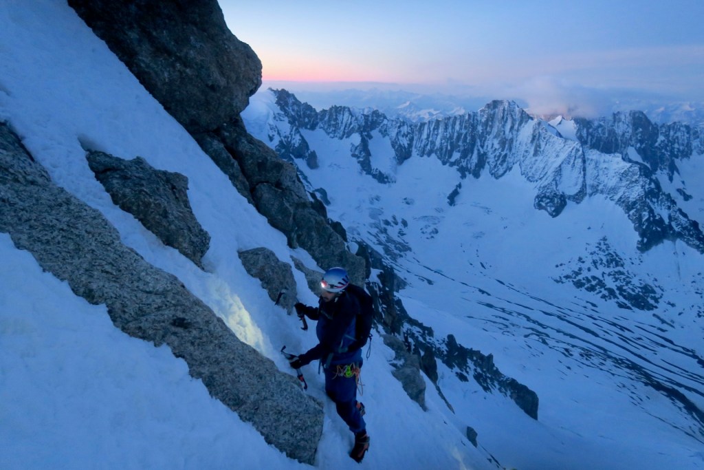 On fait toute l’approche dans la nuit noire, avec un regel très moyen. heureusement, il y avait déjà une trace ! On arrive à la rimaye un peu avant 4h du matin, qui passe très bien par la droite. on rattrape petit à petit la cordée qui nous précède, partit 1h avant, le guide Patrick Pessi et son client. une fois passé le petit couloir d’accès en conditions mixte, on décide d’un commun accord de monter sans la corde, les conditions étant excellentes dans le couloir. les première lueurs du jour a près de 4000m d’altitude nous offrent un spectacle de qualité.