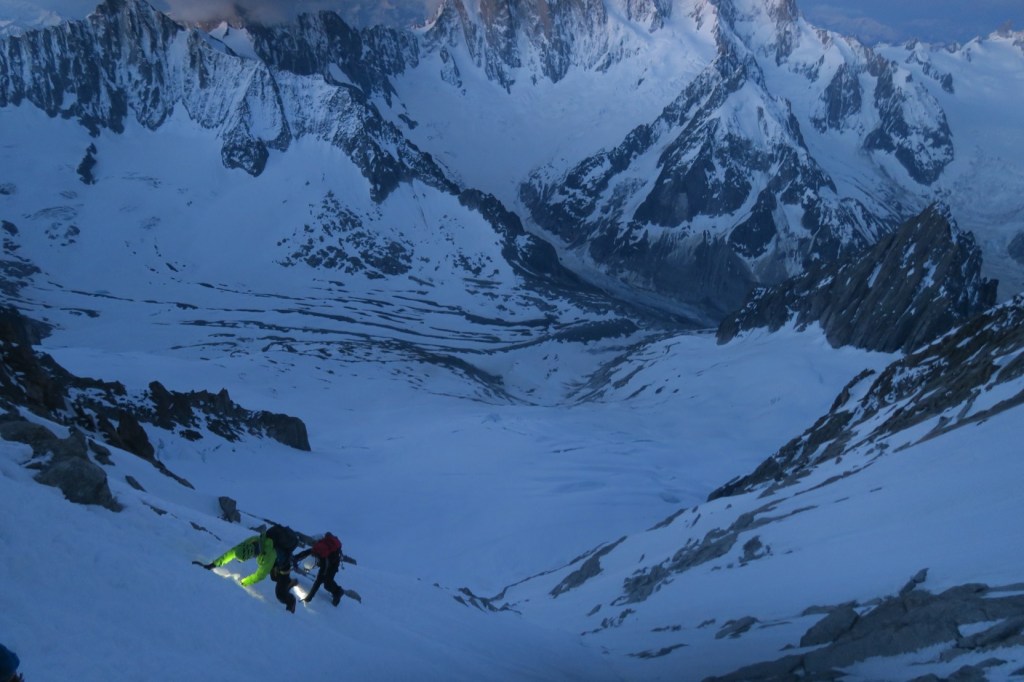 Il faut se résigner à descendre, et ce jusqu’à Chamonix.. 3200m de dénivelé.. Aie ! c’est partit pour les rappels… longs, très longs. Pas toujours bien placés, pas toujours rassurants. Moyennant un bonne technique de cramponnage, il est beaucoup plus rapide de descendre en désescalade. Résultat, avec les cordes qui s’emmellent,/ se coincent, on mettra plus de temps à descendre le couloir en rappel qu’à monter !