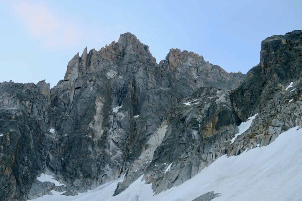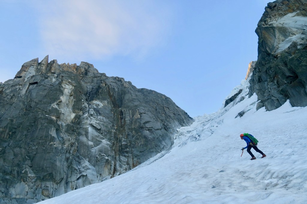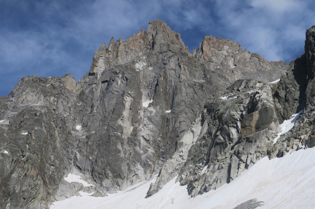 Le bas du Glacier des Nantillons encore en neige nous facilite grandement l’approche. Plus tard en saison, c’est un dédale de bloc de granite et de glace vive, nettement moins agréable.
