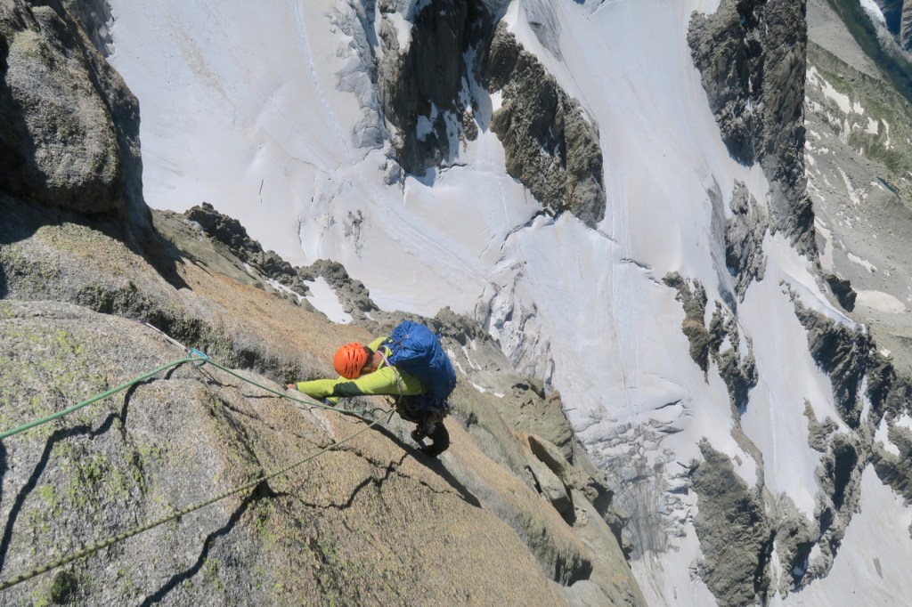 Pas envie de redescendre en rappel pour rectifier, au dessus ça a l’air de bien passer. Nous remplaçons la fissure à doigt en 5c par un grand dièdre finalement très esthétique de la même difficulté.